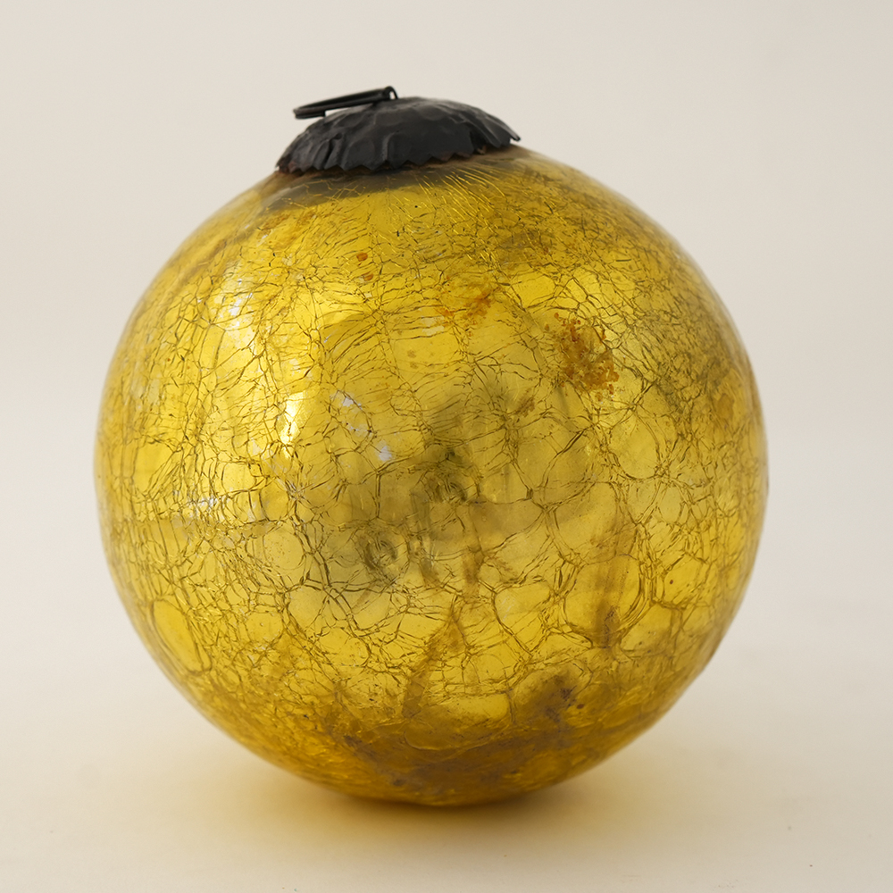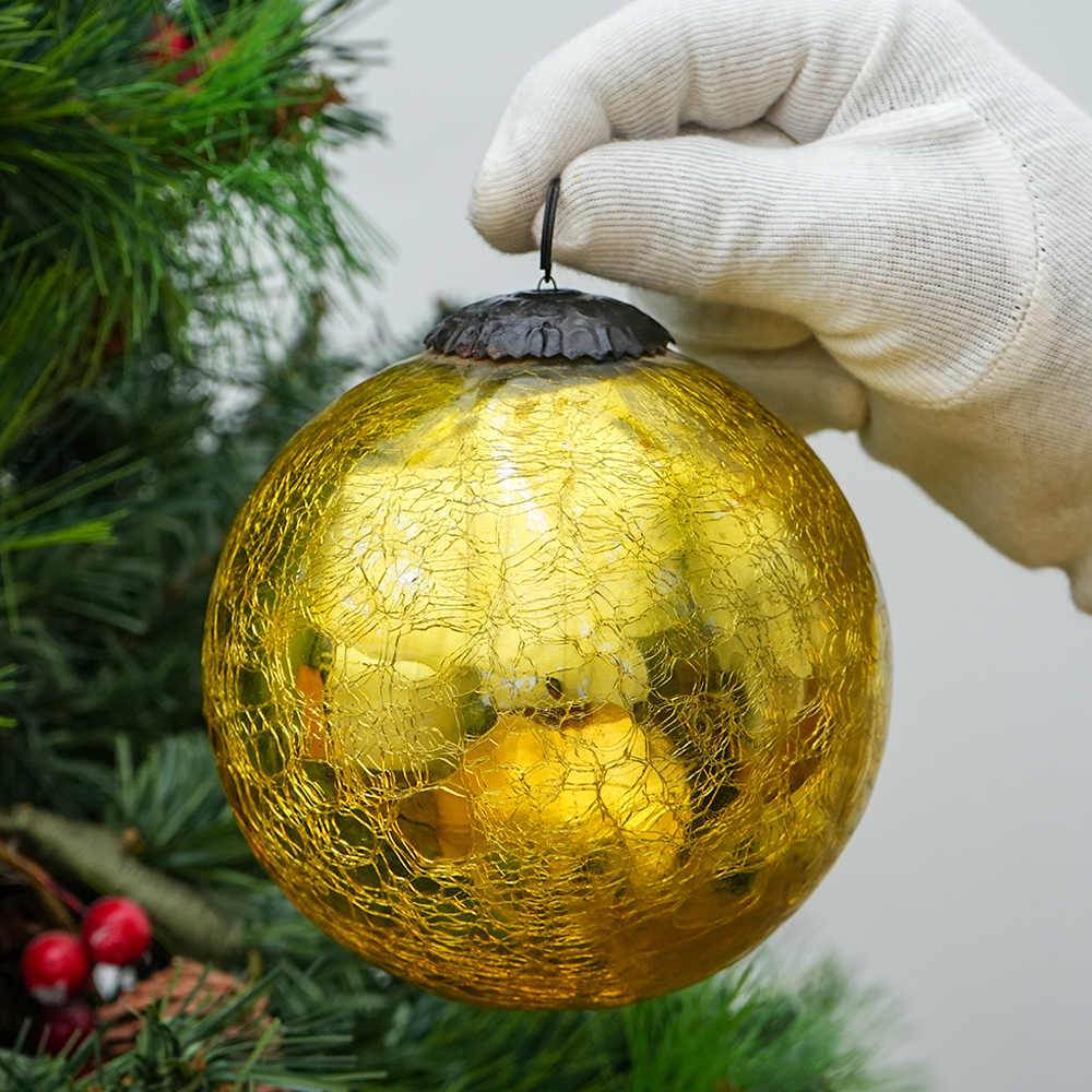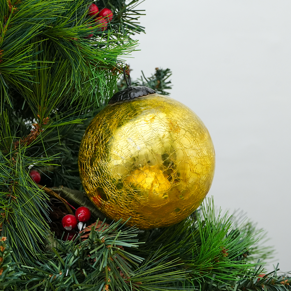 Round Gold Vintage Kugel Style Crackled Christmas Glass Hanging. Crafted from high-quality glass with a smooth glossy finish, this decorative bauble adds a classic and festive touch to Christmas trees, wreaths, and holiday displays.