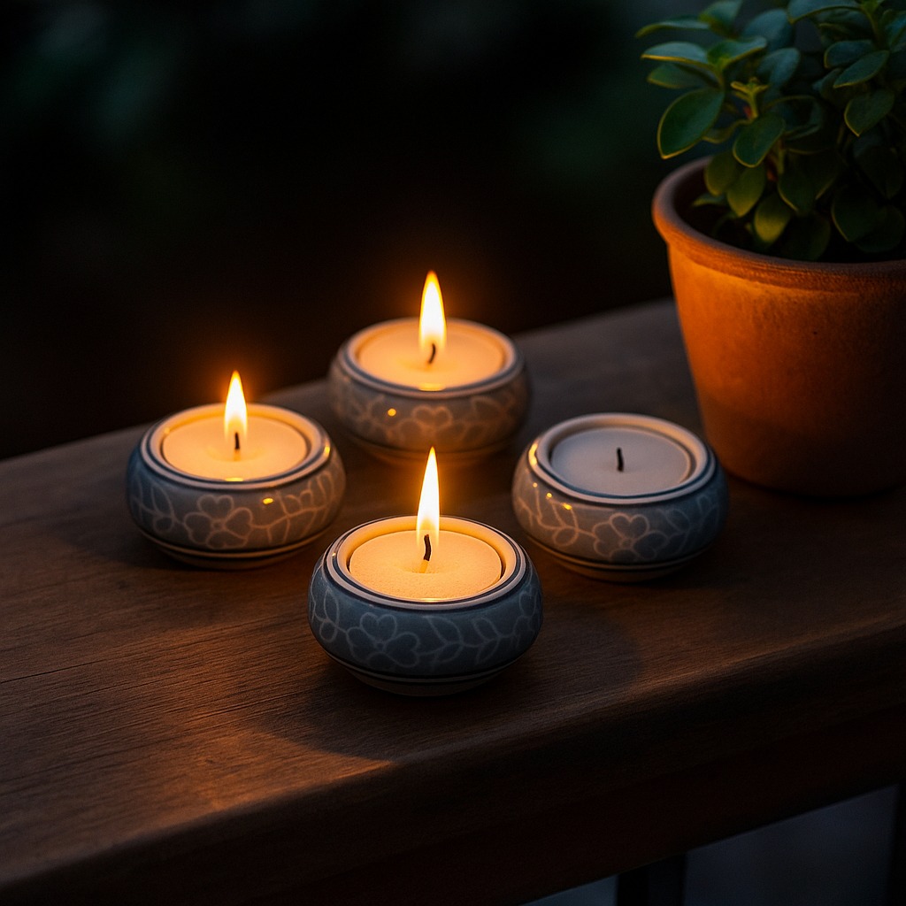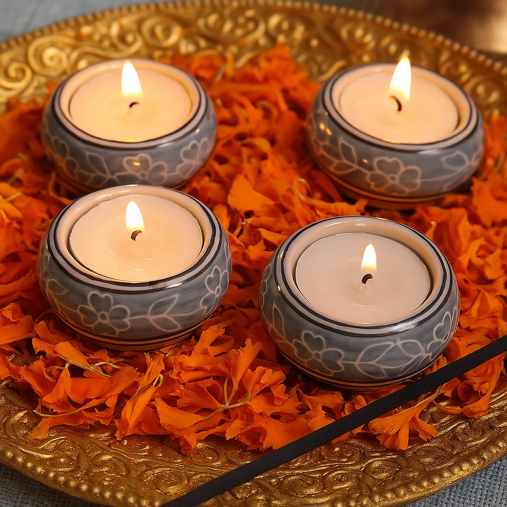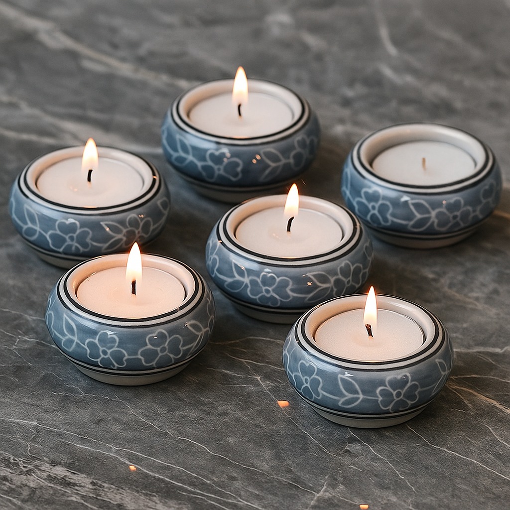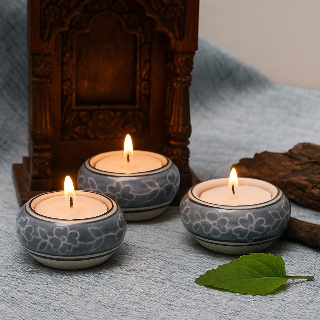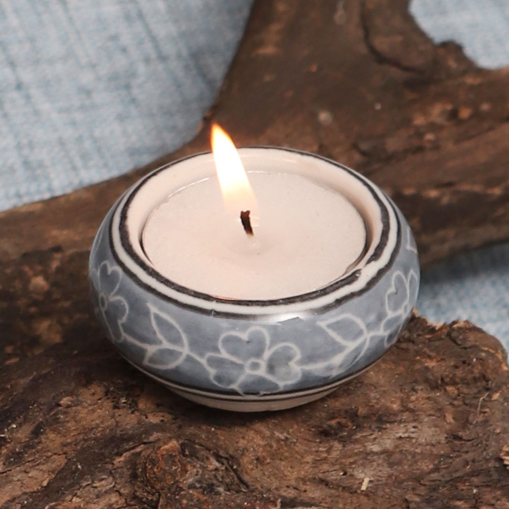 Buy a Ceramic Tea Light Holder online that is meticulously handcrafted by skilled Indian artisans and seamlessly blends artistry and functionality. Made from high-quality ceramic, its pristine white backdrop elegantly showcases a delicate blue leaf pattern, evoking a sense of tranquillity and nature's beauty. Tea light holders have been cherished for centuries for their ability to cast a warm and inviting glow, creating a soothing atmosphere. Whether adorning your home, restaurant, cafe, shop, or hotel, this tea light holder transforms any setting into a haven of serenity and charm. Its versatile design suits various occasions, from intimate dinners to grand celebrations. Imagine celebrating special moments with your loved ones, basking in the enchanting radiance of flickering tea lights. The holder's captivating blend of white and blue hues lends a timeless charm to the surroundings, making every occasion unforgettable. Thoughtful and meaningful, it also makes for a perfect gift during festive or auspicious events, conveying your affection and appreciation.