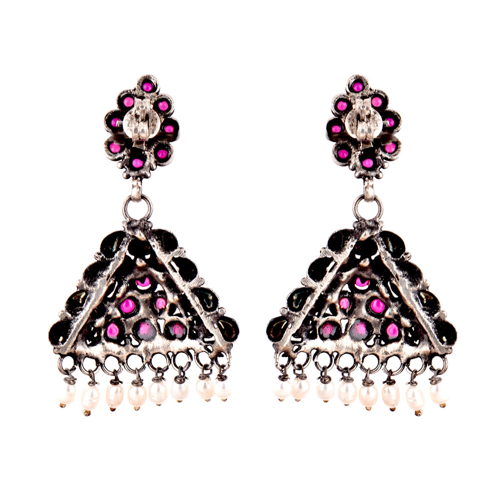 Round Pink Jade Stoned 92.5 Sterling Silver Earrings Pyramid Shaped Pearl tassel jhumki looks good with traditional as well as well as modern outfit such jeans,sari, palazzos and long kurtis.