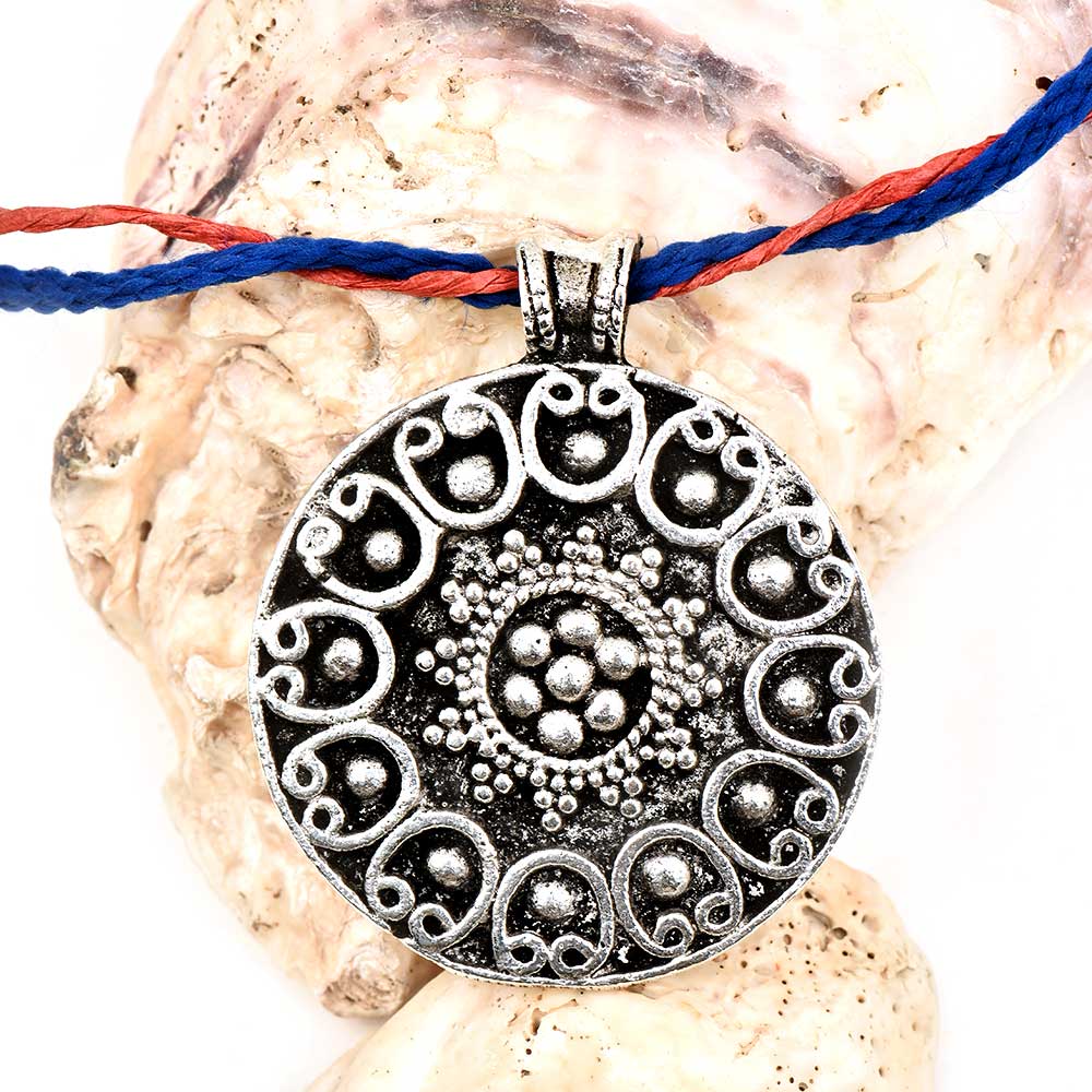 Discover the essence of traditional craftsmanship with this Round Silver Aluminum Metal Pendant Necklace, featuring intricate tribal-style inlay work that embodies heritage and artistry. Handcrafted from lightweight aluminum, this pendant showcases a beautifully balanced circular design symbolizing wholeness and unity. Its antique silver finish and textured inlay detailing make it a timeless adornment — blending the bold spirit of tribal design with modern elegance.