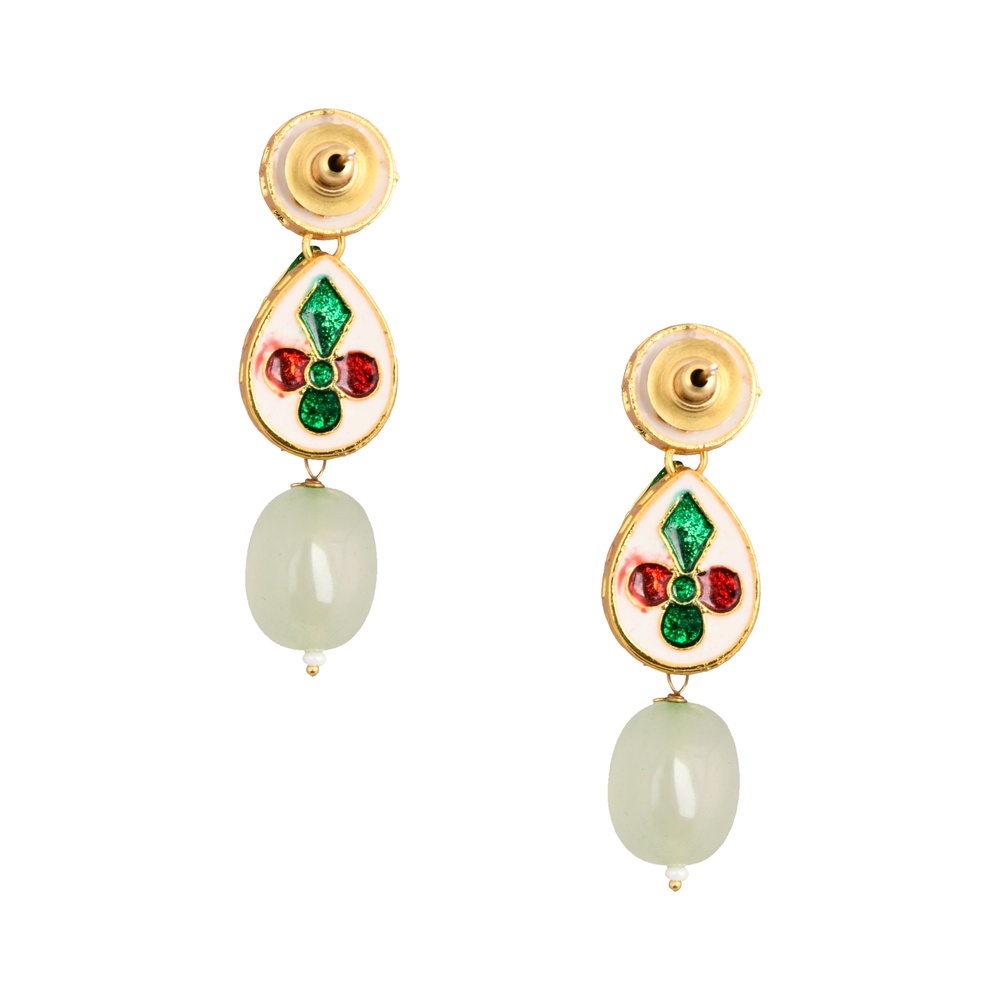 These earrings are handcrafted using traditional techniques and feature a sleek combination of round and teardrop mirrors with a green bead drop, ensuring each pair is one-of-a-kind and durable.