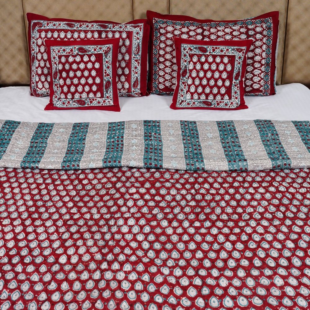 This red and teal Malmal (Voile) quilt reflects timeless Rajasthani craftsmanship with its intricate hand-block printed motifs and geometric design. Made from lightweight cotton voile, it combines elegance, comfort, and durability. Expertly handmade and quality-checked by Indianshelf, this quilt is perfect for adding a touch of Indian heritage to your space.