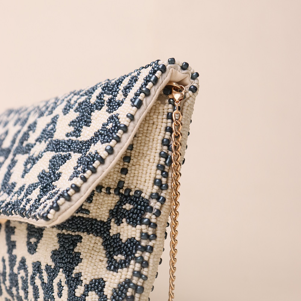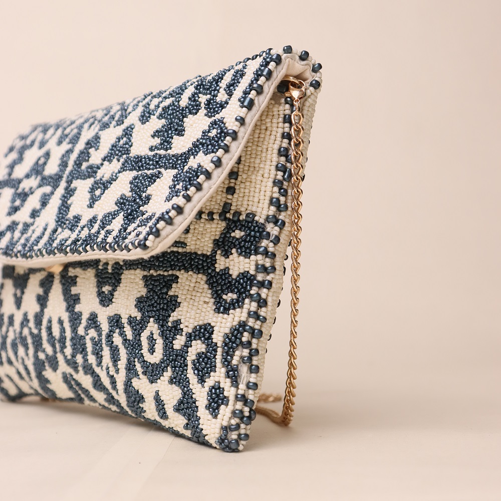 A striking blend of traditional artistry and modern elegance, this hand-beaded sling bag features a captivating ikat-inspired pattern in deep indigo and ivory. The intricate beadwork showcases skilled craftsmanship, while the envelope silhouette adds timeless sophistication. Designed with a detachable gold-tone chain strap, this versatile piece can be worn as a crossbody, shoulder bag, or carried as a clutch. Perfect for cultural events, evening outings, and statement styling.
