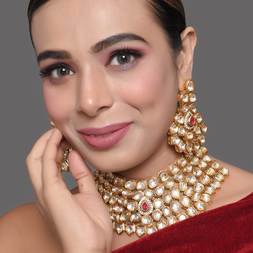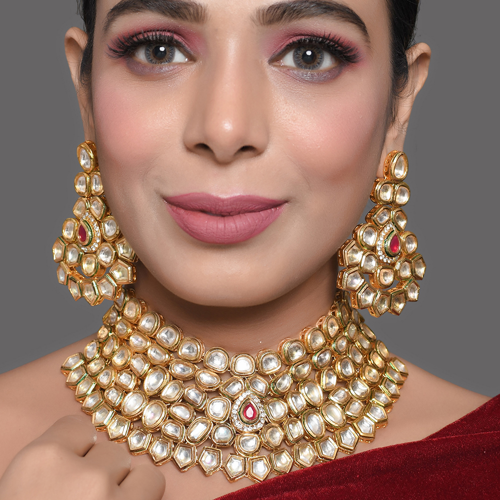 Bold, opulent, and meticulously detailed, this mirror stone bridal choker necklace set is crafted to command attention during weddings and ceremonial occasions. The choker showcases a tightly arranged pattern of reflective stones, anchored by a ruby-toned centre element that adds richness and regal contrast. The set is completed with matching statement earrings and a coordinated maang tikka for a cohesive bridal ensemble. Bridal Choker Set Highlights Thoughtfully handcrafted, this jewellery set blends traditional artistry with structured design for a powerful visual impact. Statement choker necklace with layered mirror-style stone composition Ruby-toned centre accent for depth and focal elegance Coordinated handcrafted earrings and matching maang tikka Comfort-focused choker profile suitable for long wear Created using heritage jewellery-making techniques Specs & Materials Material: Metal alloy with mirror-style stones and coloured accent stone Colour: Warm gold tone with reflective clear stones and ruby highlight Design: Structured bridal choker set with earrings and maang tikka Origin: Handmade in India and individually quality-checked Minor variations may occur due to handcrafted workmanship Necklace features adjustable tie-back for a secure fit Styling & Gifting Inspiration Ideal for bridal wear, wedding ceremonies, and festive occasions Pairs beautifully with lehengas, sarees, and heavily embroidered outfits A refined gifting option for brides and special milestones Adds grandeur and definition without overpowering the look Care Guide Store the jewellery in a dry pouch away from moisture and direct sunlight. Avoid contact with perfumes, water, or harsh chemicals. Clean gently with a soft cloth after use to preserve shine. Artisan Craftsmanship This complete jewellery set is made using traditional handcrafting methods. Every piece is handcrafted never machine-made ensuring individuality, character, and timeless appeal.
