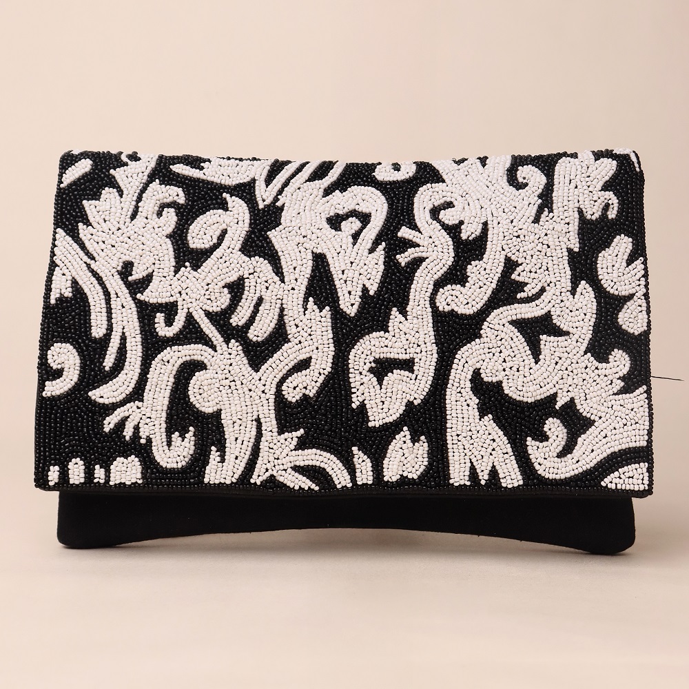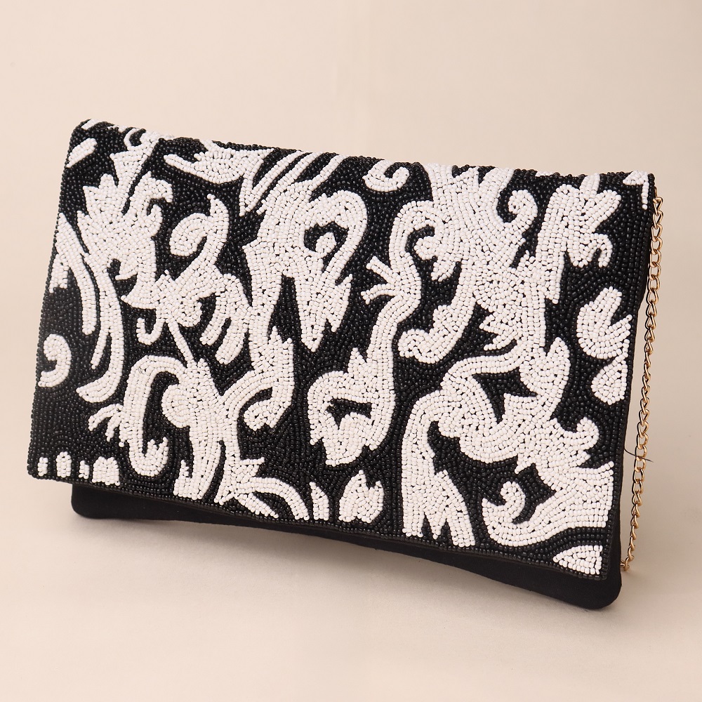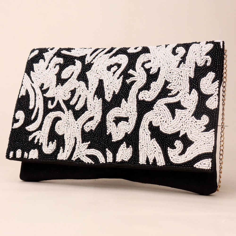 Inspired by timeless baroque artistry, this handcrafted beaded clutch blends opulence with elegance. The striking pattern captures attention with its fluid, ornamental design, making it a standout accessory for evening events and upscale gatherings. Equipped with a detachable chain strap, this clutch easily transforms from a shoulder carry to a handheld statement piece.