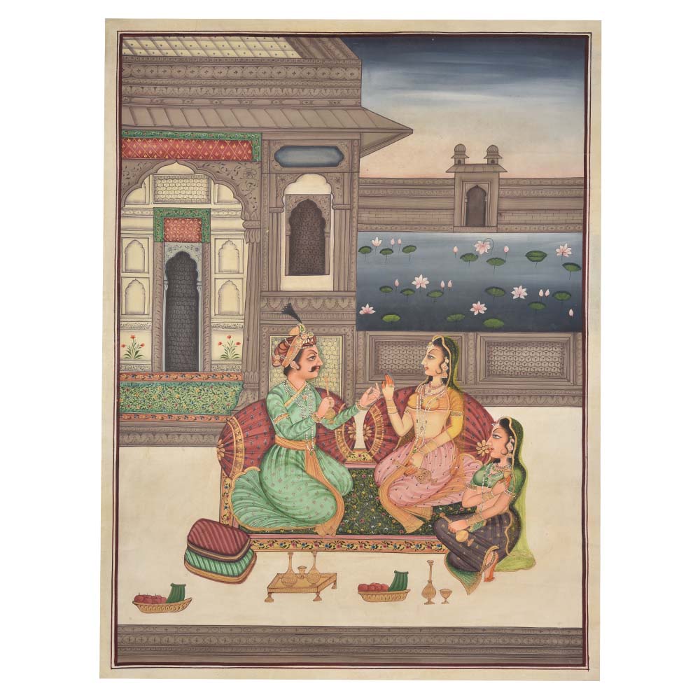 This is a beautiful Mughal love painting depicting the Mughal maharajah and Mughal Lady in love. This Indian miniature painting was created by a skilled artist with years of experience and was painted with natural colours. This Mughal king and lady portrait depicts the eternal love that Mughal couples once had.