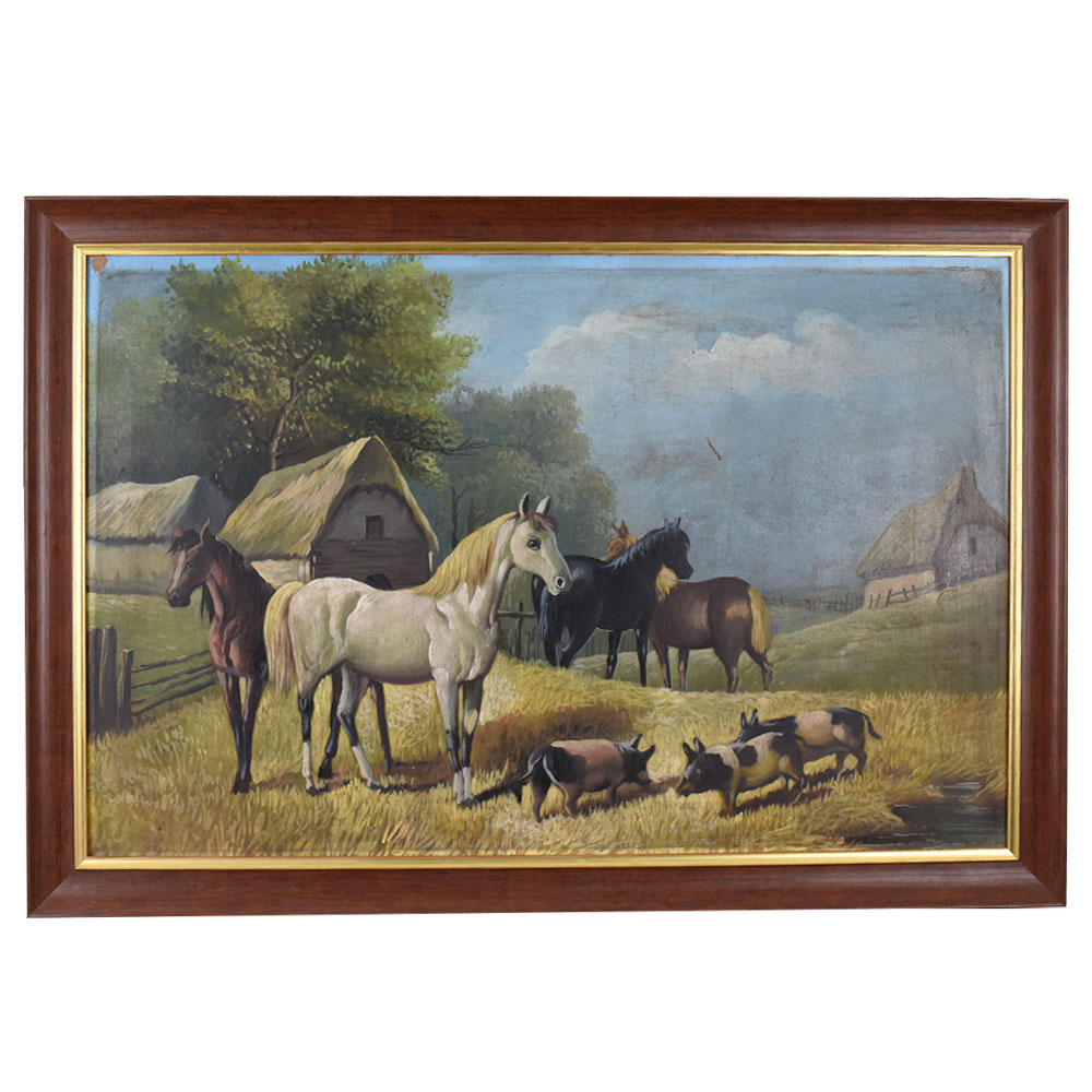 This charming oil painting on hardboard beautifully captures a pastoral farmyard scene, rich in rustic character and natural tranquility. In the foreground, a group of four sleek, muscular horses stands amidst a golden field of harvested hay, their coats rendered in shades of white, chestnut, and black. Each horse is painted with fine attention to anatomy and posture, reflecting the artist’s skill in portraying animal grace and strength. Nearby, a small herd of black-and-white pigs roots through the stubble, adding life and movement to the composition. The background features quaint thatched-roof cottages nestled among lush green trees, with soft hills rolling into the distance under a pale blue sky. The interplay of light and shadow lends depth to the scene, while the warm tones of the field contrast harmoniously with the cooler hues of the trees and sky. Executed with a classic realist style, this painting evokes the peaceful charm of rural farm life and the harmonious coexistence of animals in an agricultural setting. Its detailed brushwork and balanced composition make it an ideal decorative piece for country homes, farmhouses, or collectors of equestrian and pastoral art.
