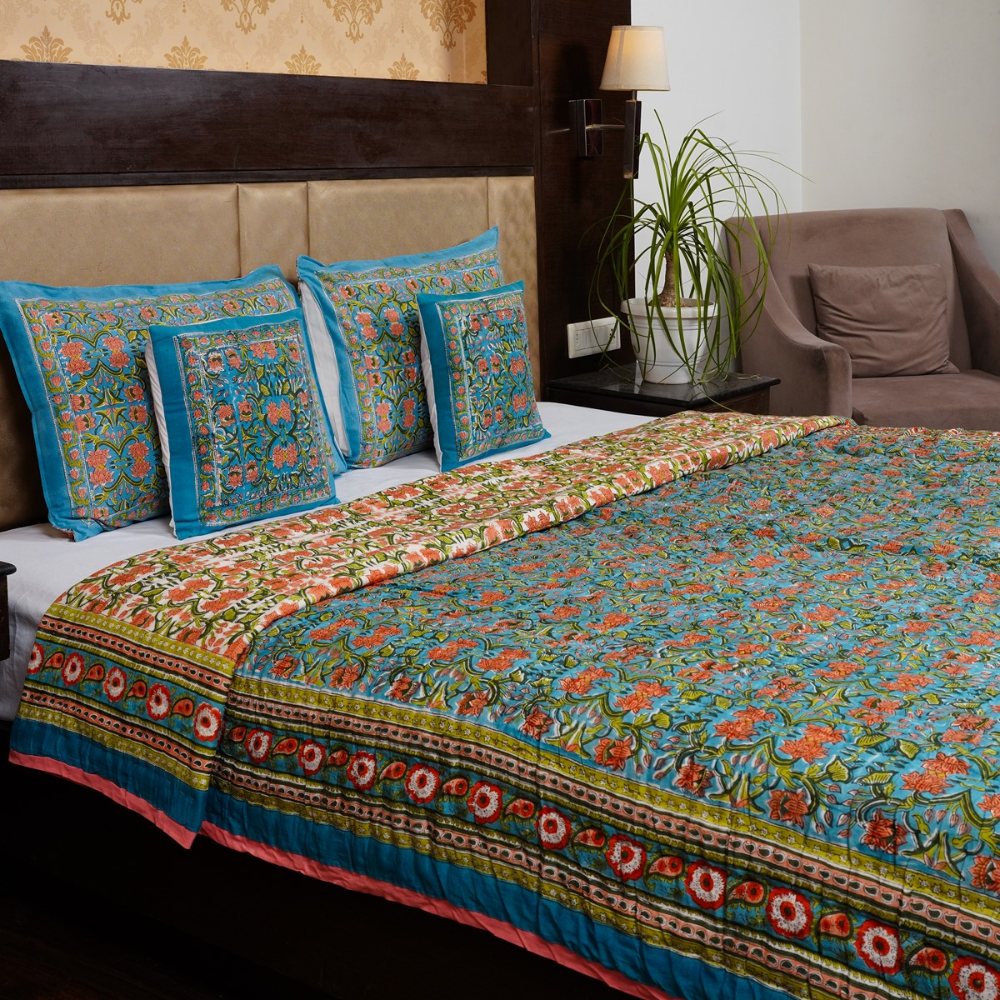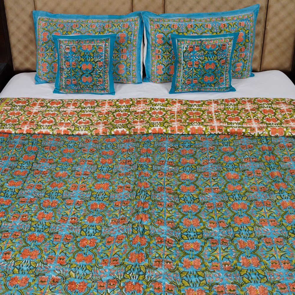 This turquoise multicolor Malmal (Voile) quilt is a vivid expression of Indian hand-block printing heritage, featuring intricate floral motifs in shades of orange, blue, and green. Made from fine cotton voile, it offers breathable softness and timeless beauty. Expertly handmade and quality-checked by Indianshelf to ensure artisan excellence and comfort in every piece.