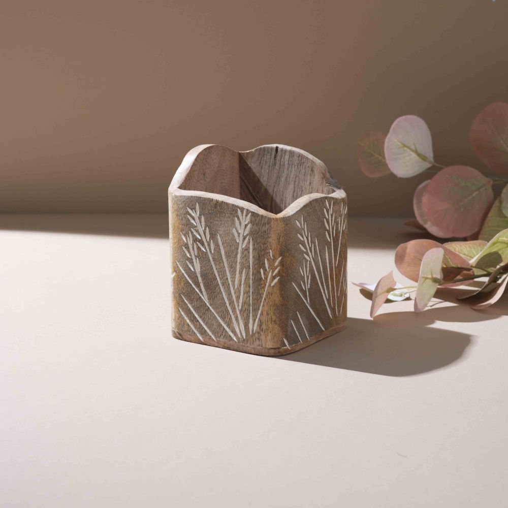 The Sirevest Rustic Leaf-Engraved Wooden Spoon Holder combines functionality with natural elegance. Crafted from high-quality wood, this spoon holder features an intricately engraved leaf design, adding a rustic charm to your kitchen or dining area. Its sturdy structure keeps your cooking spoons organized and easily accessible. Perfect for those who appreciate both practicality and aesthetic appeal in their home décor.