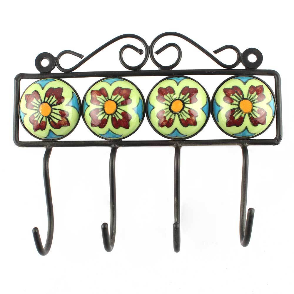 Sage Green Ceramic Floral Tiles Hook. When Put on Wall or Cabinet It is An Art in Itself. The Metal Part of this Hook is Black Powder Coated.
