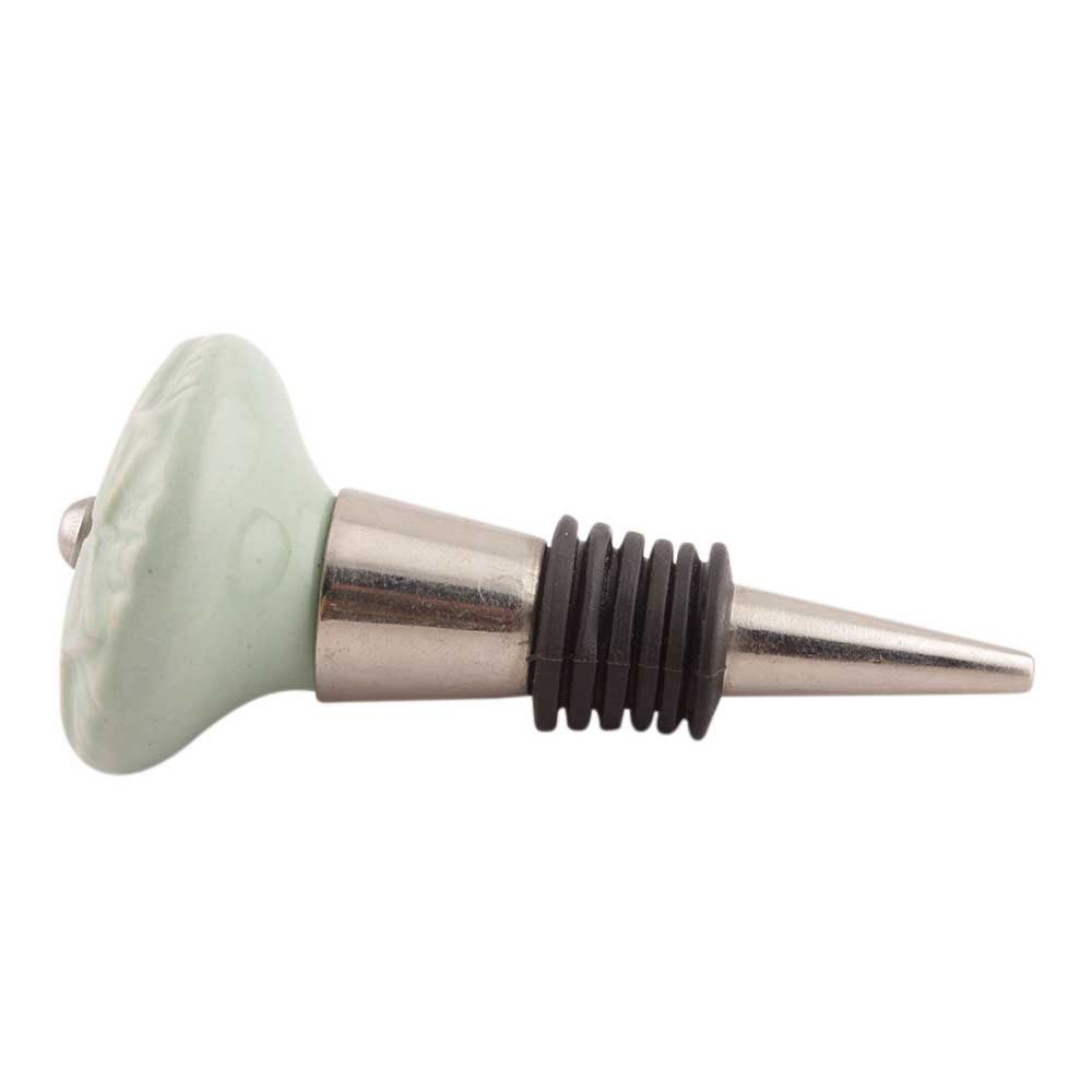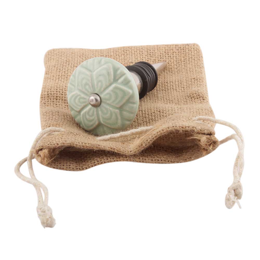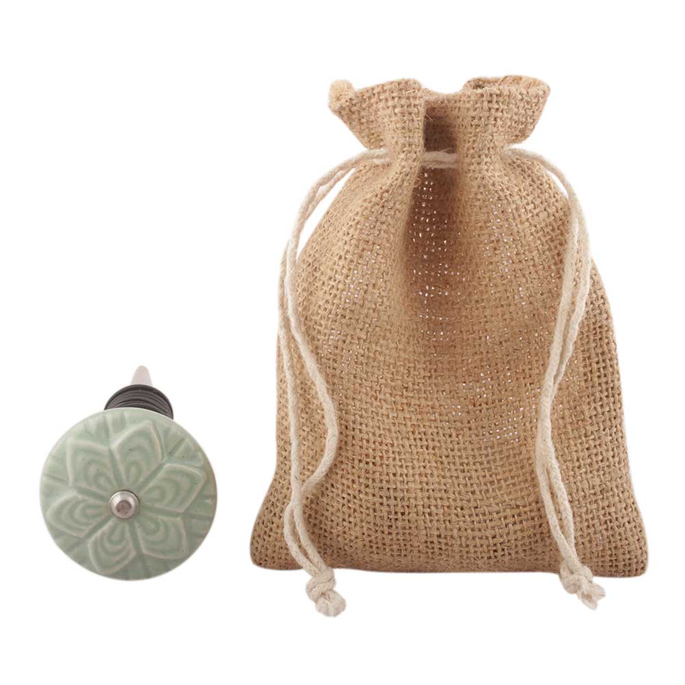 Sage Green Ceramic Flower Wine Stopper. Zinc Alloy Wine Bottle Stopper with Attractive Jute Bag Packaging.