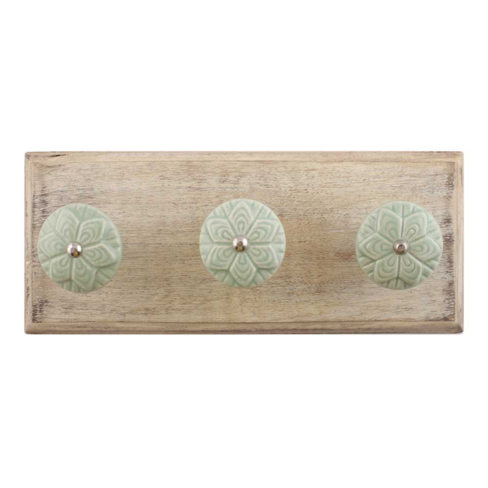 Sage Green Ceramic Flower Wooden Hooks. A Perfect Complement to the Soft Tone of the Wood are these White Traditional Hat and Coat Hook Made of Genuine Porcelain and Brass. It can be used to Hang Jewelry, Leashes, Towels, Scarves, Light Weight Sweaters, Caps etc.