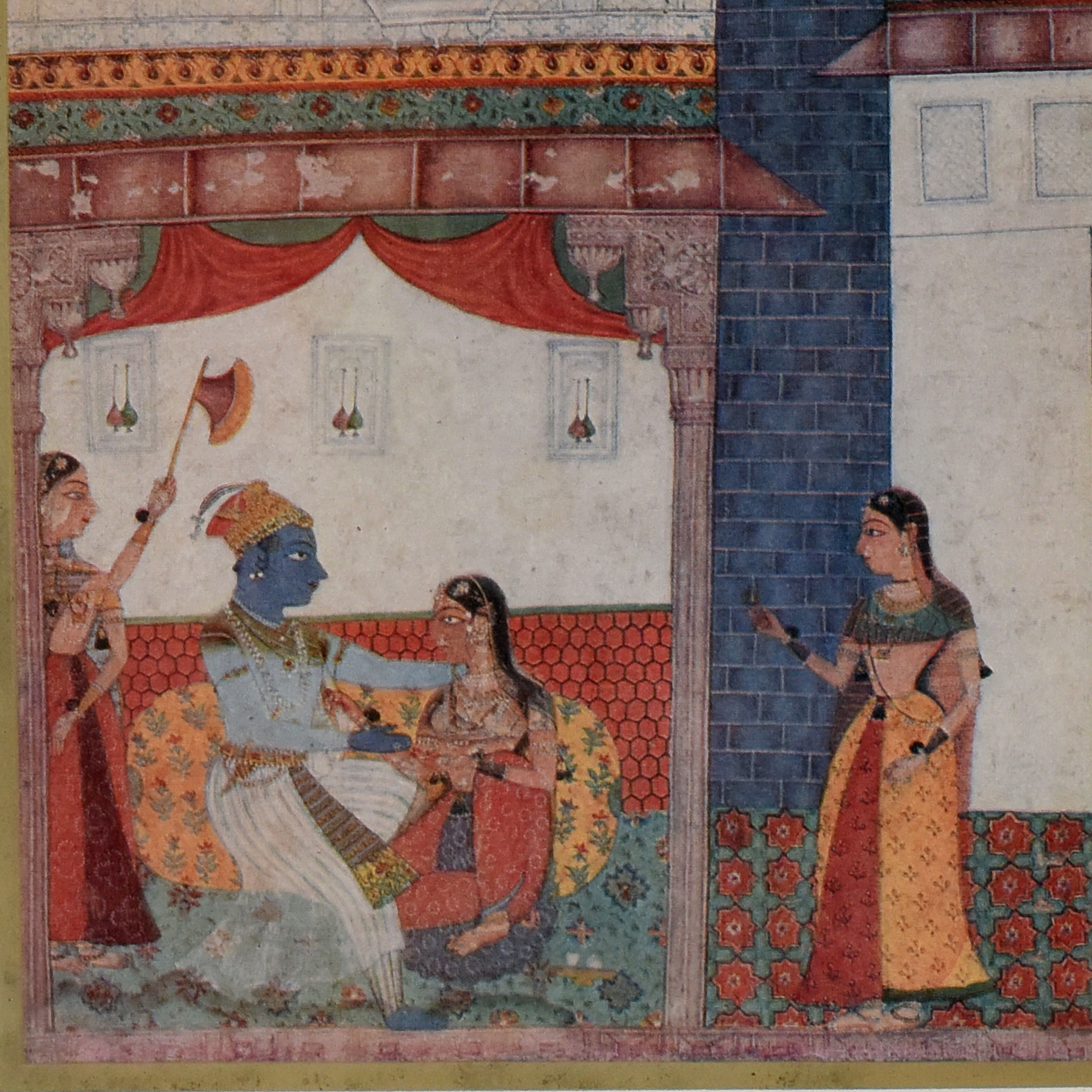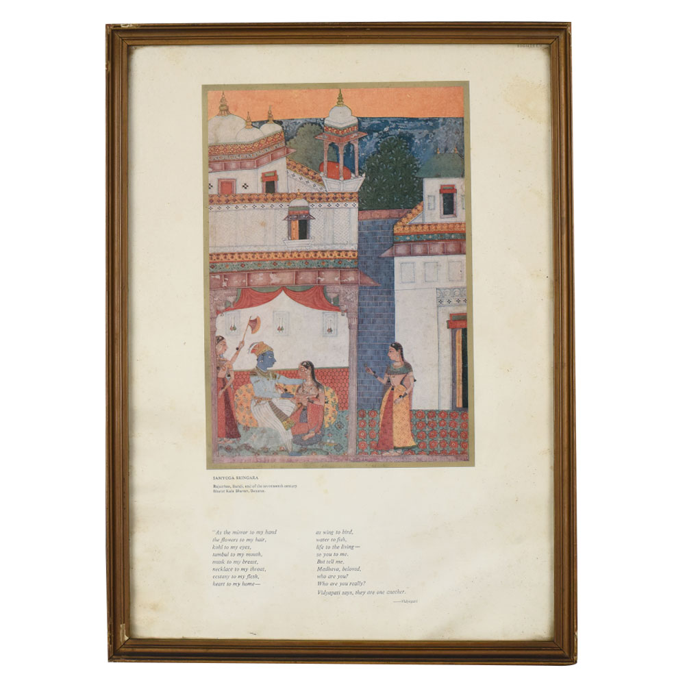 This exquisite paper print titled Samyoga Sringara is a beautiful example of late 17th-century Rajasthani art from Bundi, preserved in the Bharat Kala Bhavan, Banaras. The scene depicts a romantic and intimate moment between Krishna, shown in his iconic blue form, and Radha, seated together in a richly adorned courtyard. Krishna reaches out toward Radha in a gesture of affection, while attendants look on, adding to the narrative depth of the composition. The architecture in the background, with its ornate domes, chhatris, and intricately patterned walls, reflects the grandeur of Bundi palace architecture. The vibrant reds, golds, and blues are hallmarks of Bundi miniature painting, conveying both regal elegance and tender emotion.
