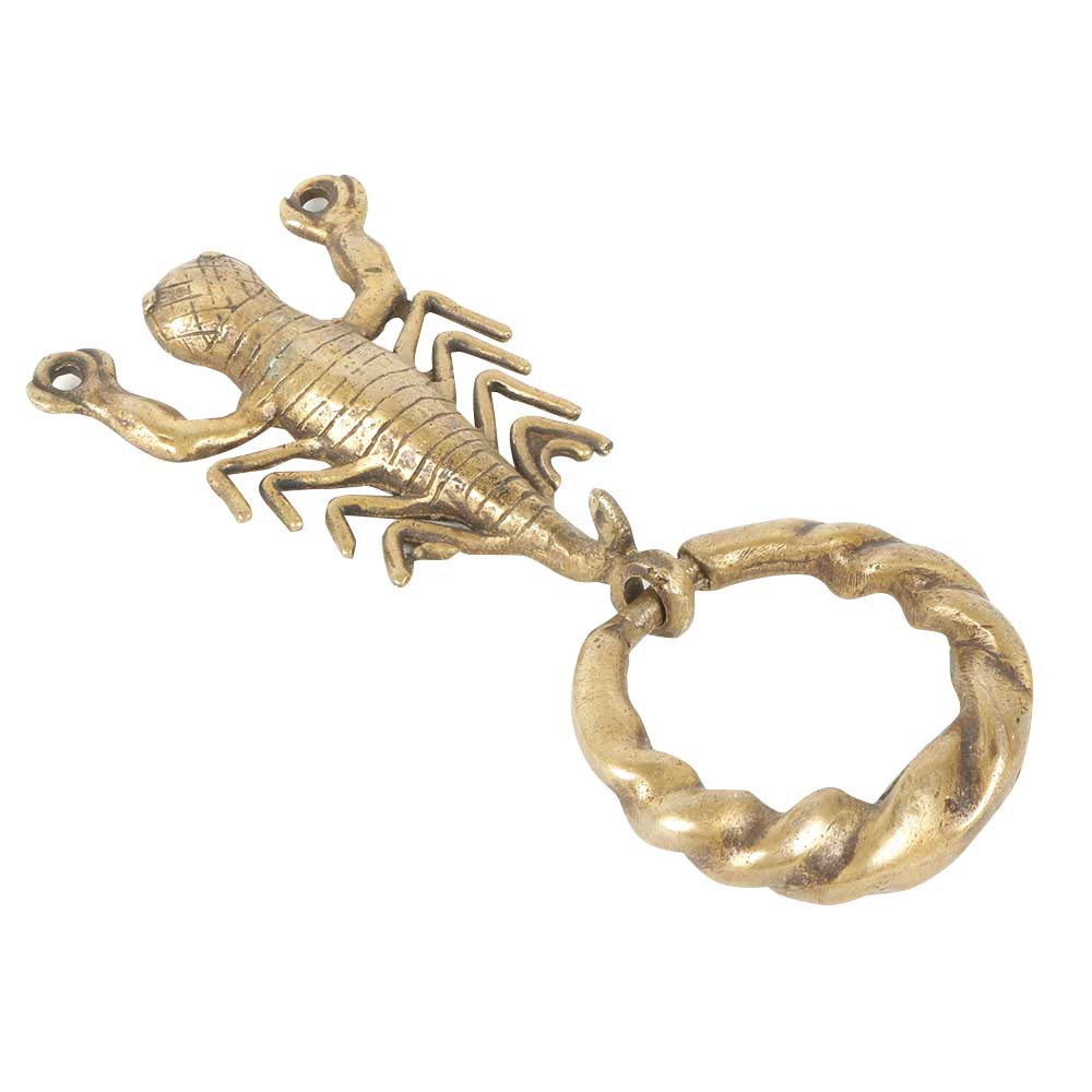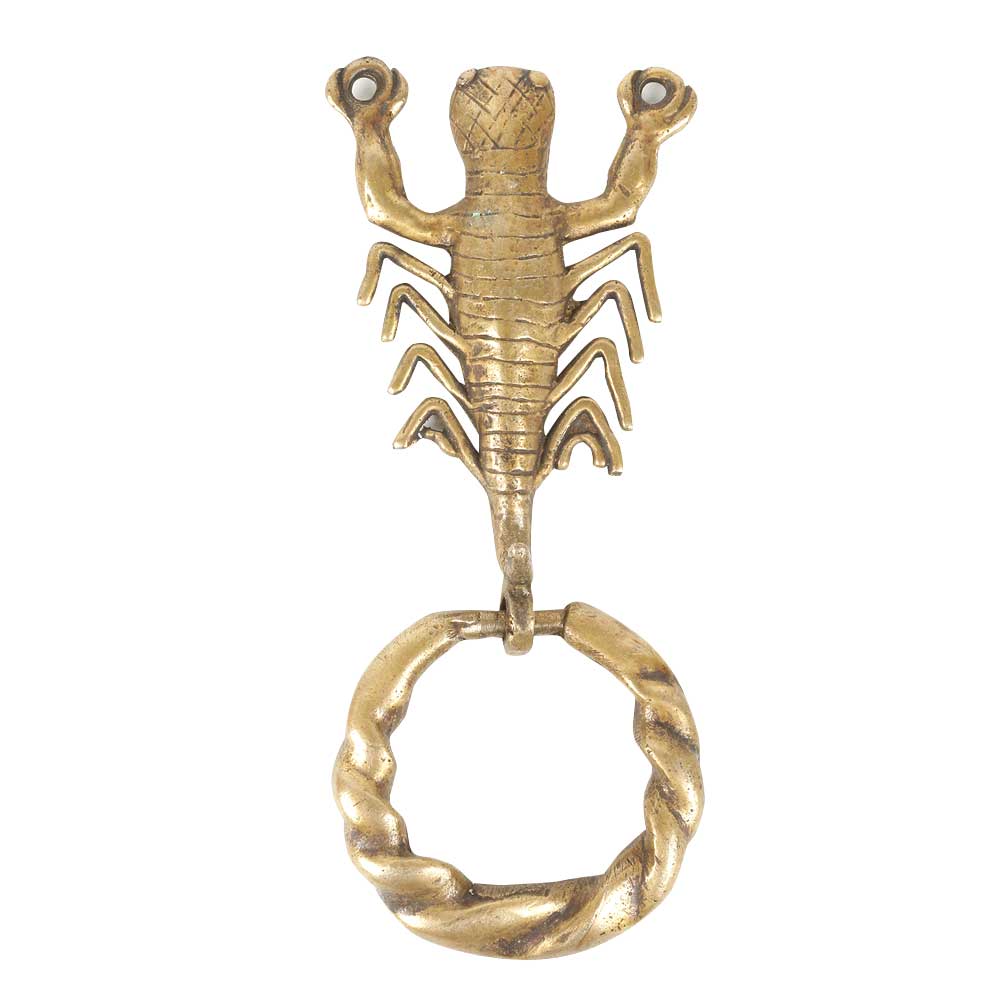 An exquisite work of art by the skilled craftsman of India. It can be used for door Knocker as well as home decor. Golden colour engraved decorative brass metal door knocker having Scorpion Design.