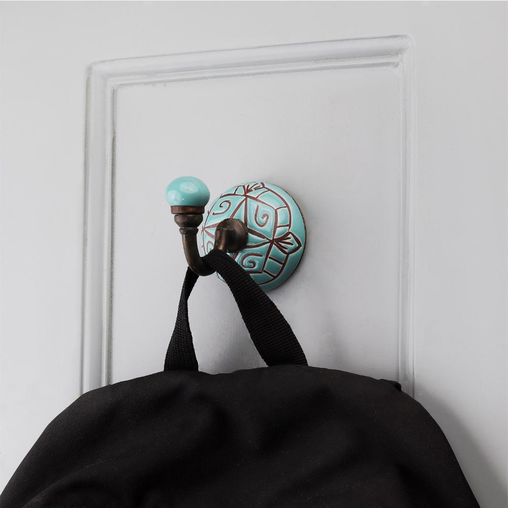 Sea Green And Brown Etched Ceramic Wall Hook. When Put on Wall or Cabinet It is An Art in Itself. This Hook is Strong Enough to Hold Your Cloths, Keys, Tea Cups, Coffee Mugs, Hand Towels etc.