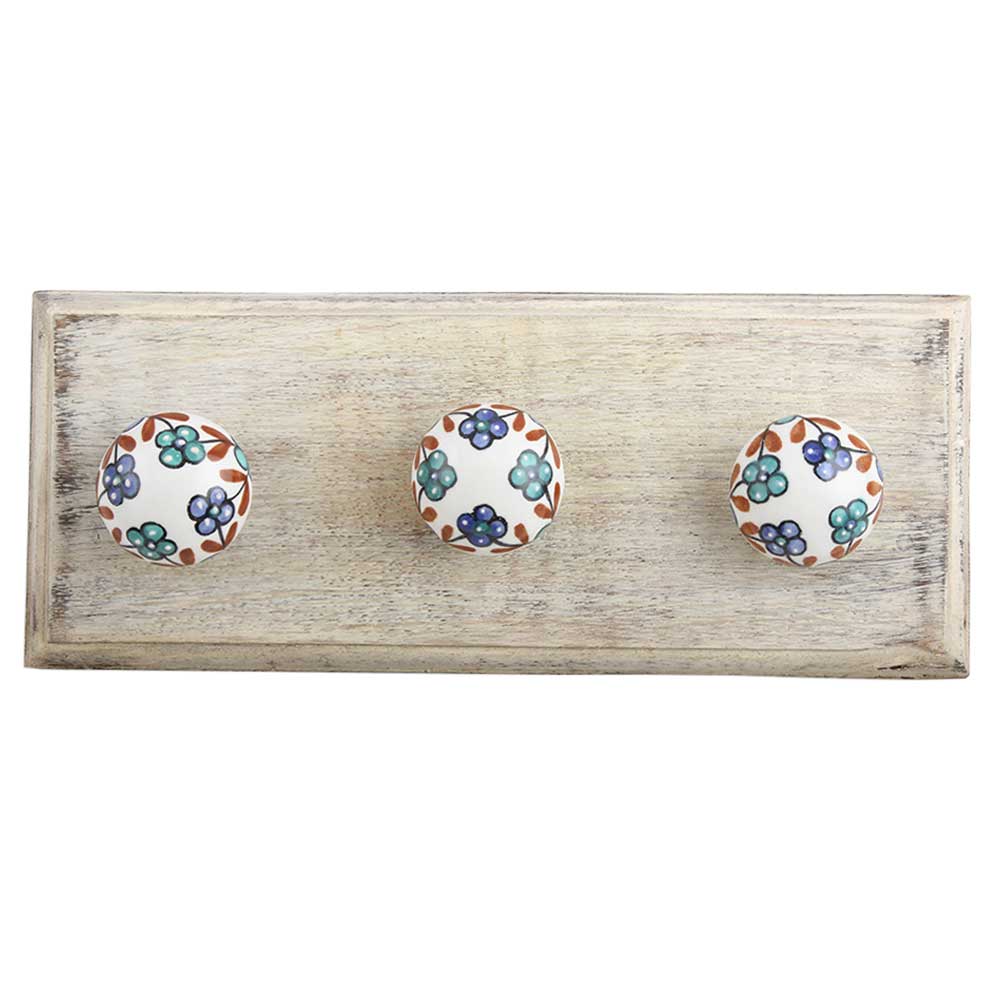 Sea Green And Slate Blue Tiny Flower Ceramic Wooden Hook. A Perfect Complement to the Soft Tone of the Wood are these White Traditional Hat and Coat Hook Made of Genuine Porcelain and Brass. It can be used to Hang Jewelry, Leashes, Towels, Scarves, Light Weight Sweaters, Caps etc.