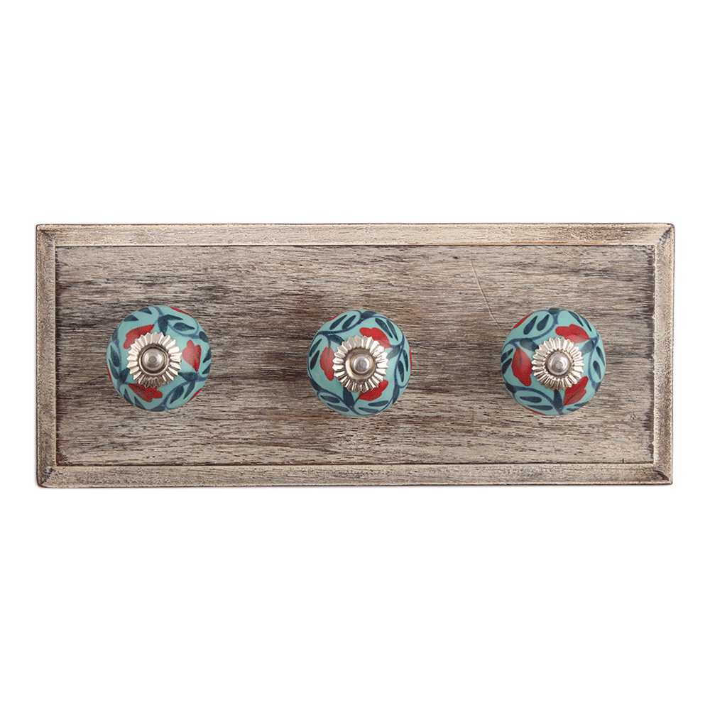 Sea Green Flower Ceramic Wooden Hook. A Perfect Complement to the Soft Tone of the Wood are these White Traditional Hat & Coat Hook Made of Genuine Porcelain and Brass. It can be use to Hang Jewellery, Leashes, Towels, Scarves, Light Weight Sweaters, Caps Etc.