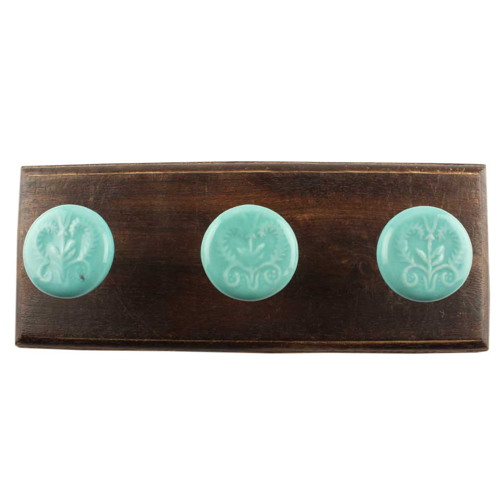 Botanical Ceramic Wall Hook – Sea Green Floral Design on Wood Base for Natural Home Storage