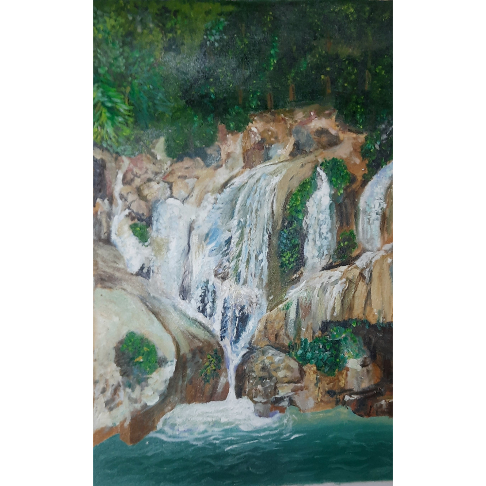 Bring home the calming power of nature with this beautifully detailed Acrylic on Canvas painting by Artist Gayatri Sharma, titled Serene Waterfall in Forest. Measuring 25 x 16 inches, this handmade masterpiece captures the dynamic flow of cascading waterfalls nestled in a lush, green forest landscape. From the rocky terrain to the emerald green pool below, every stroke reflects the artist’s connection with nature. The interplay of textured water, mossy rocks, and dense foliage evokes a peaceful escape into the wilderness. It’s a visual retreat that adds depth, tranquility, and natural charm to any interior setting. This artwork is ideal for nature lovers, wellness spaces, or anyone seeking a grounding, serene element for their decor.