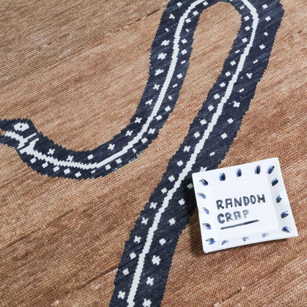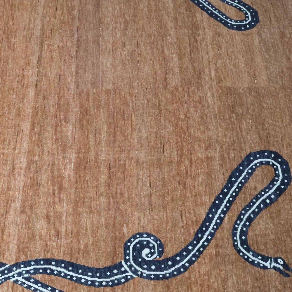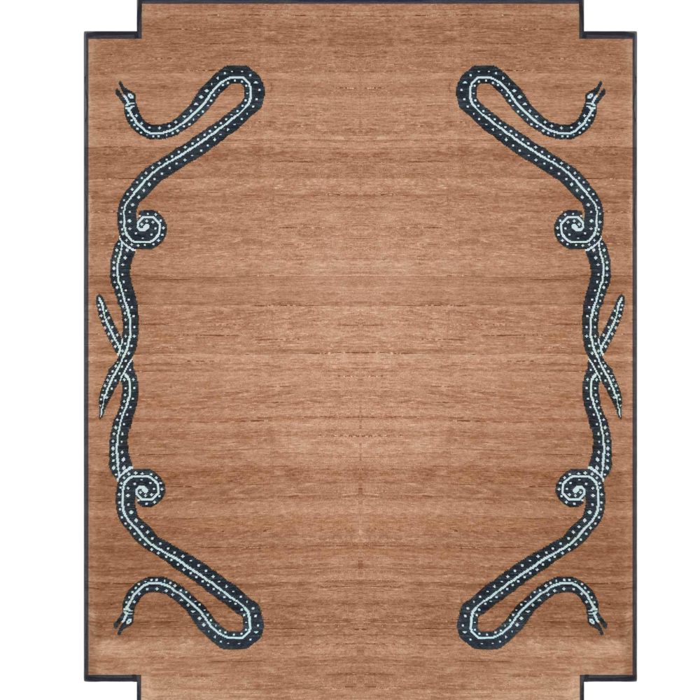 Bold. Artistic. Iconic. The Serpentine Border Hand-Knotted Wool Rug is a true statement piece that merges mythic symbolism with elevated design. Framed by two mirrored serpents intricately winding along the borders, this rug commands attention while maintaining a refined aesthetic with its warm, earthy brown field and sculpted rectangular silhouette. Meticulously Hand-Knotted in India Crafted using traditional hand-knotting techniques by master artisans, this rug is a testament to detail and quality. Symbolism Meets Style The serpentsrendered in deep navy and accented with subtle ivory dot worksymbolize transformation, protection, and rebirth. Their rhythmic curves frame the rug like artwork, while the tonal brown backdrop keeps the overall look grounded and sophisticated. The notched rectangular edges further elevate the composition, giving this rug a tailored, gallery-worthy presence. High-Quality Wool Construction Woven from 100% natural wool, this rug offers incredible softness, resilience, and natural stain resistance. The subtle sheen and fine texture of the wool enhance the depth of both the motif and the solid brown base, giving the piece a luxurious finish. Ask ChatGPT As it Appears Pack of One Piece.
