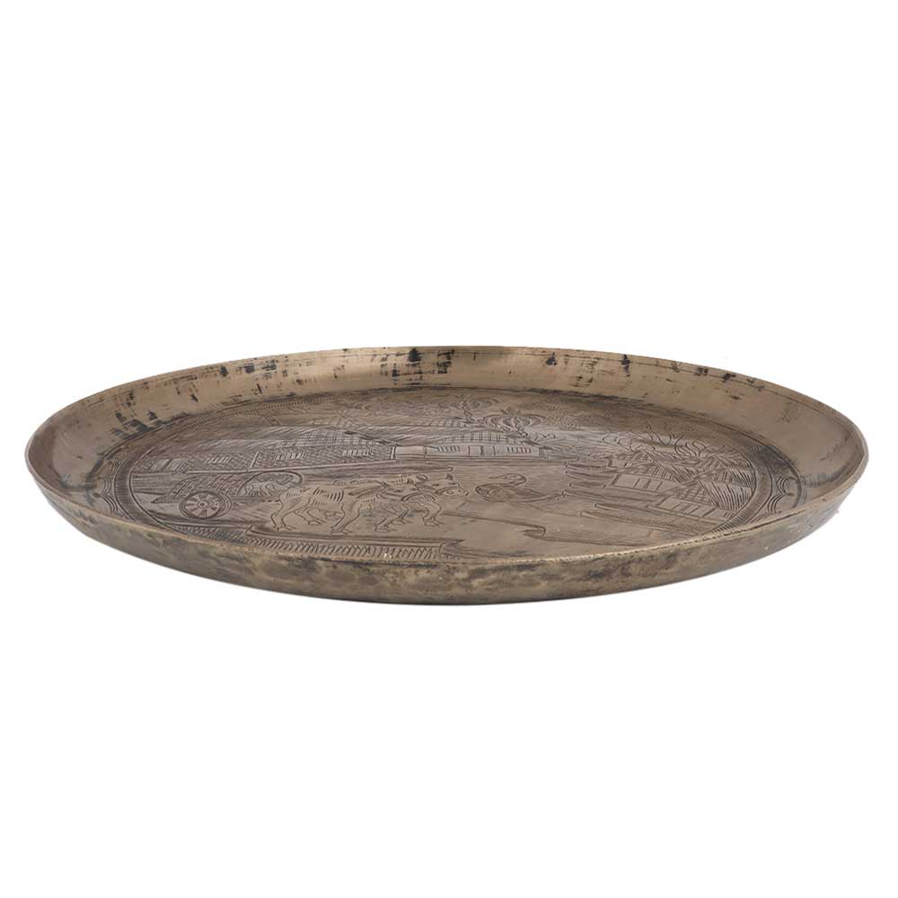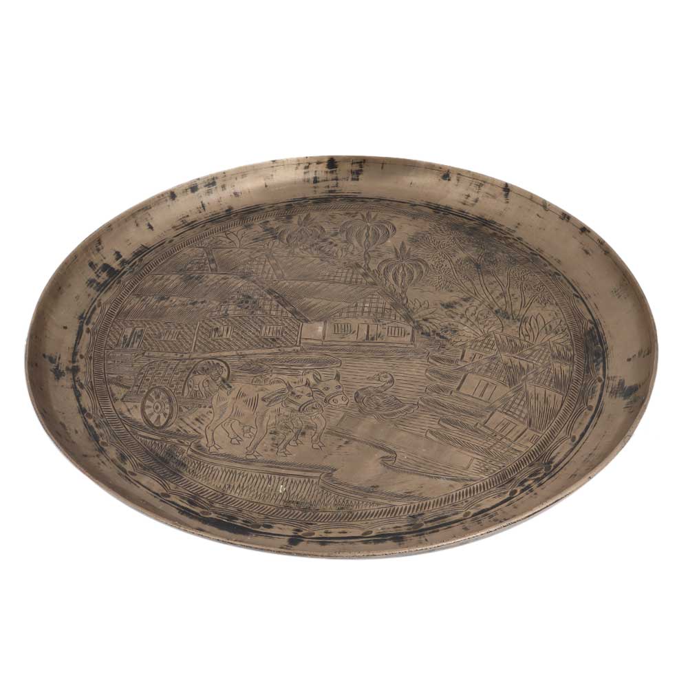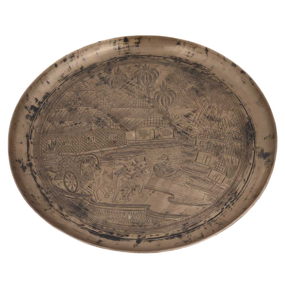 A lovely engraved south indian vintage bell metal tray or plate with rural house, coconut trees, bullock cart , duck in pond etc. Serveware,Tableware, dinnerware, wall decoration for home, office, restaurant, clubs . Anniversary gift, new year gift. Gifting option for your near and dear ones.