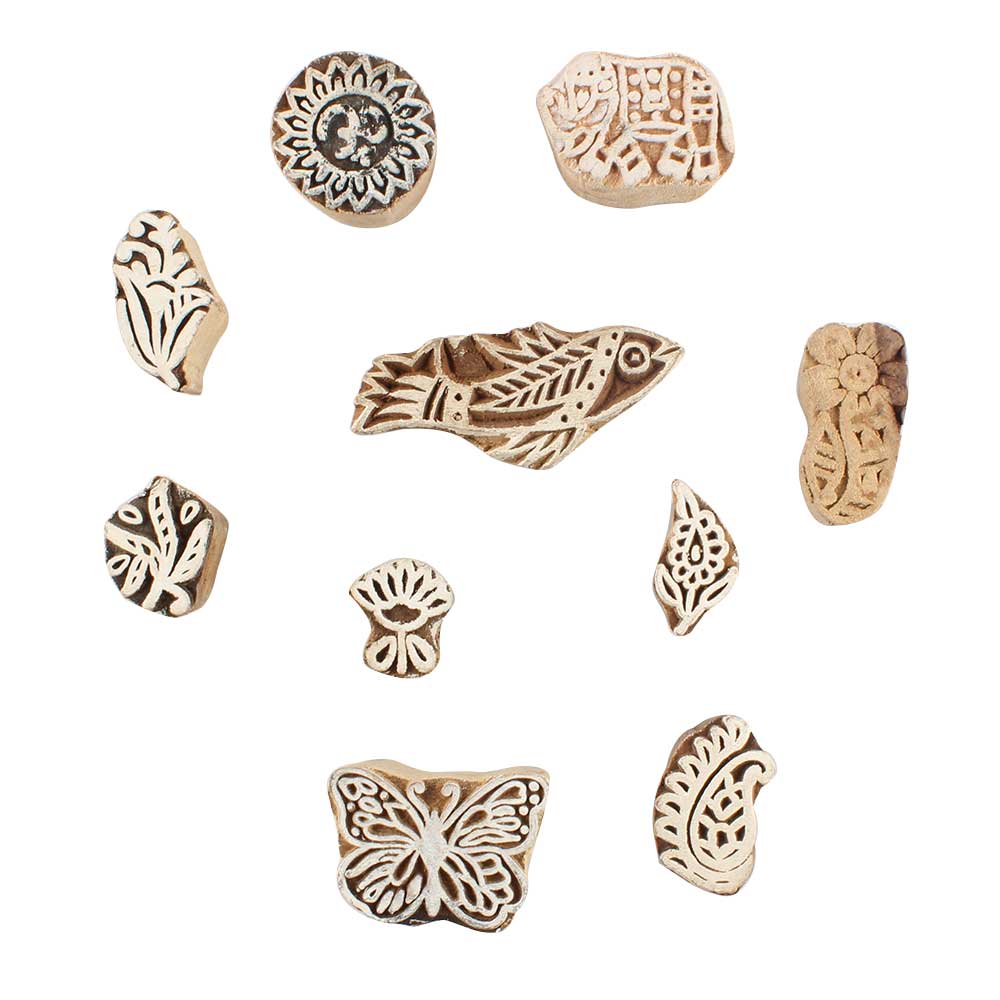 Set of 10 Piece New Mix Wooden Printing Block. Ideal for use on Fabric, Paper, Canvas, etc. These Blocks can be use to Print with Oil Colors, Fabric Colors, Water Colors, Acrylic Colors and Vegetable Colors.