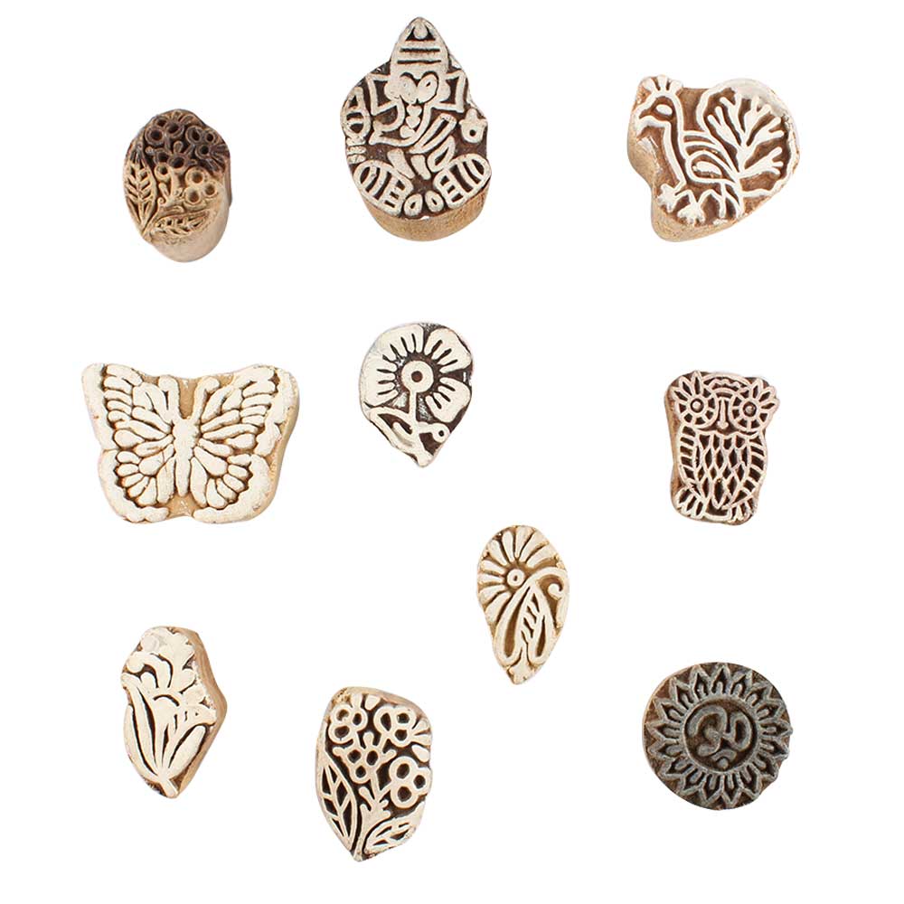 Set of 10 Piece New Mix Wooden Printing Block. Ideal for use on Fabric, Paper, Canvas, etc. These Blocks can be use to Print with Oil Colors, Fabric Colors, Water Colors, Acrylic Colors and Vegetable Colors.