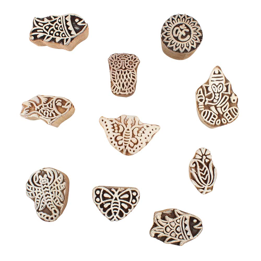Set of 10 Piece New Mix Wooden Printing Block. Ideal for use on Fabric, Paper, Canvas, etc. These Blocks can be use to Print with Oil Colors, Fabric Colors, Water Colors, Acrylic Colors and Vegetable Colors.