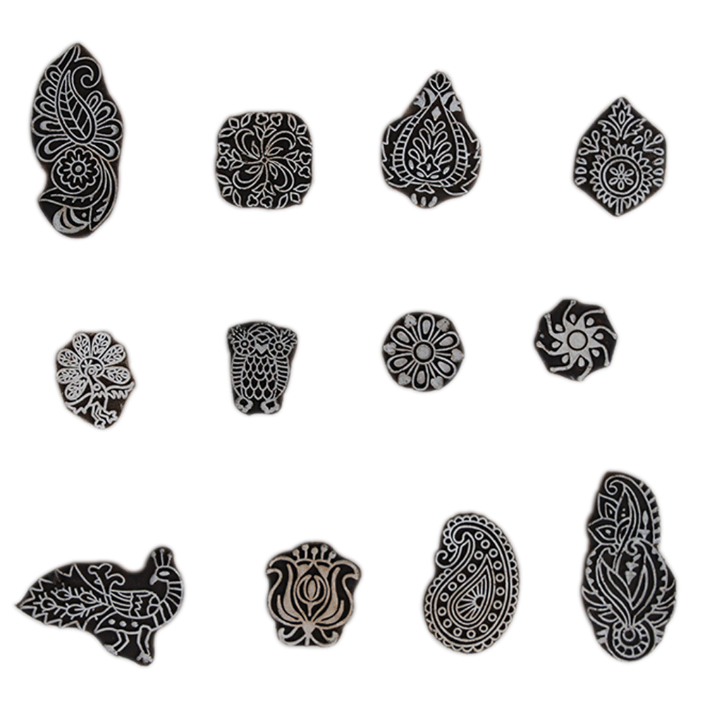 Set of 12 Piece New Mix Wooden Printing Block. Ideal for Using on Fabric, Paper, Canvas, etc. These Blocks can be use to Print with Oil Colors, Fabric Colors, Water Colors, Acrylic Colors and Vegetable Colors.