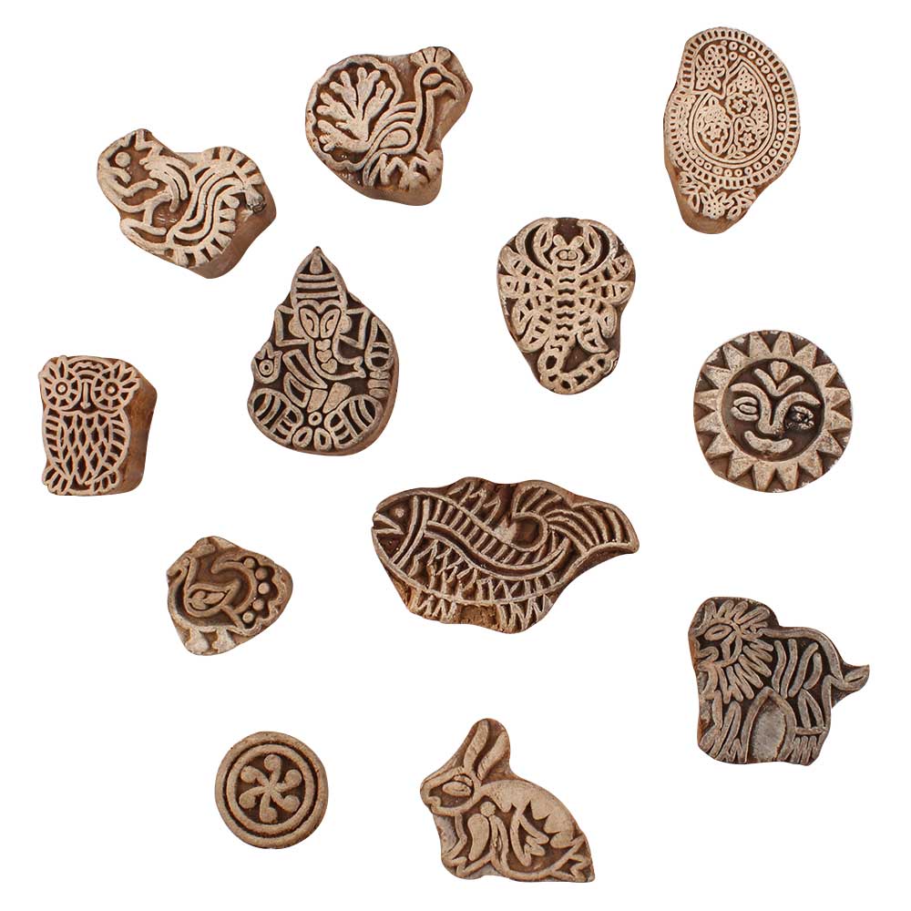 Set of 12 Piece New Mix Wooden Printing Blocks. Ideal for use on Fabric, Paper, Canvas, etc. These Blocks can be use to Print with Oil Colors, Fabric Colors, Water Colors, Acrylic Colors and Vegetable Colors.