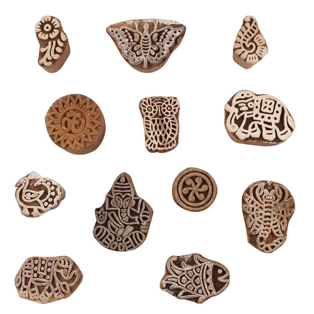 Set of 12 Piece New Mix Wooden Printing Blocks. Ideal for use on Fabric, Paper, Canvas, etc. These Blocks can be use to Print with Oil Colors, Fabric Colors, Water Colors, Acrylic Colors and Vegetable Colors.
