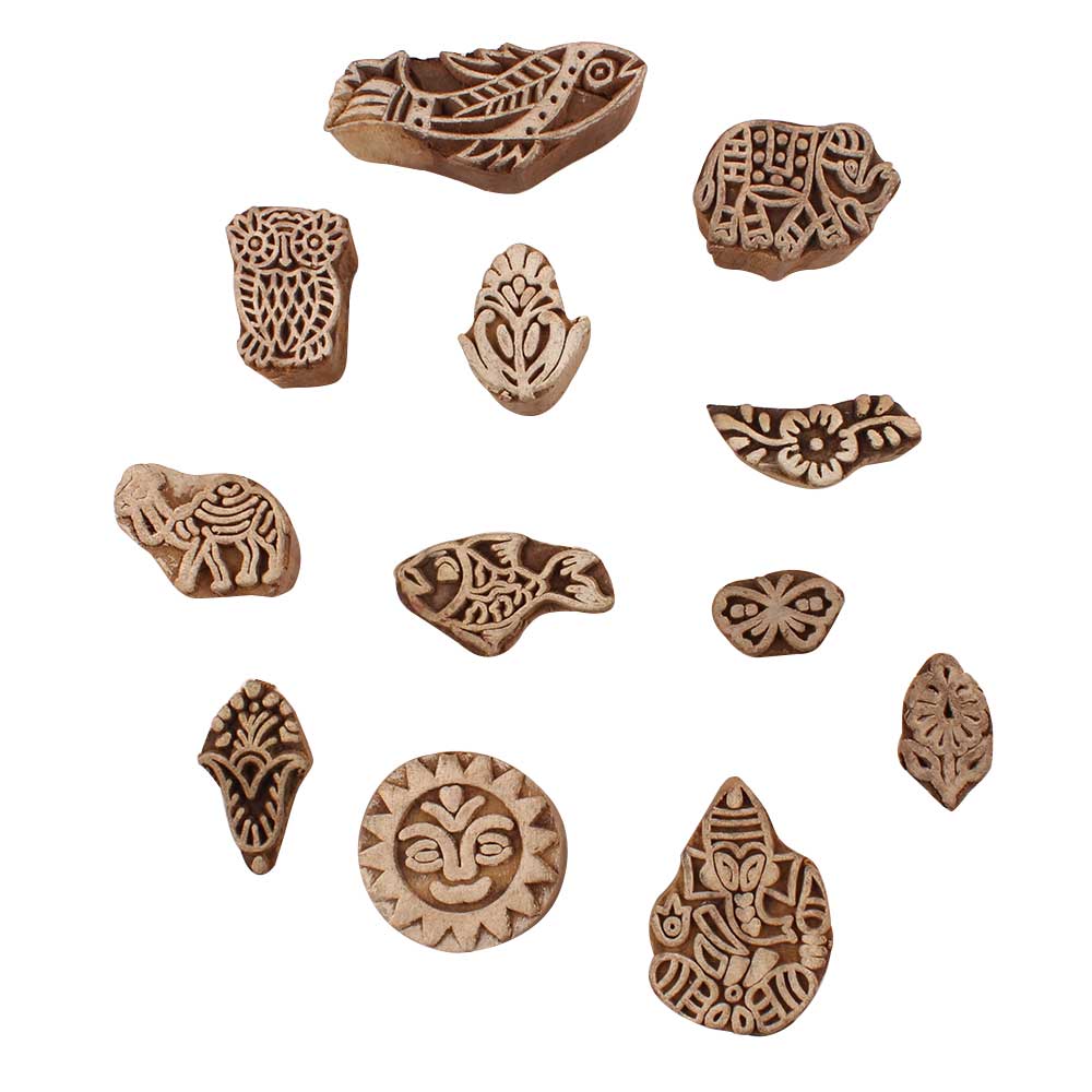 Set of 12 Piece New Mix Wooden Printing Blocks. Ideal for use on Fabric, Paper, Canvas, etc. These Blocks can be use to Print with Oil Colors, Fabric Colors, Water Colors, Acrylic Colors and Vegetable Colors.