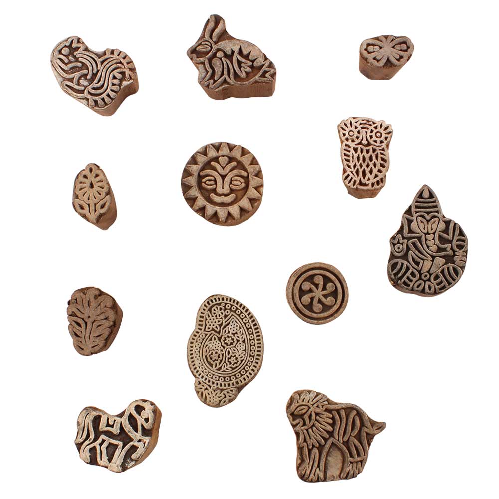 Set of 12 Piece New Mix Wooden Printing Blocks. Ideal for use on Fabric, Paper, Canvas, etc. These Blocks can be use to Print with Oil Colors, Fabric Colors, Water Colors, Acrylic Colors and Vegetable Colors.
