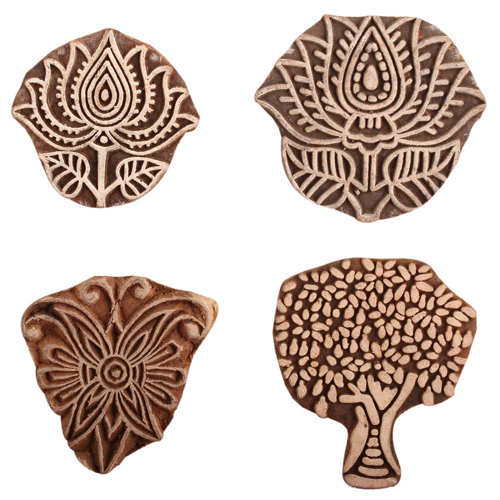 Set of 4 Piece New Mix Wooden Printing Block. Ideal for use on Fabric, Paper, Canvas, etc. These Blocks can be use to Print with Oil Colors, Fabric Colors, Water Colors, Acrylic Colors and Vegetable Colors.