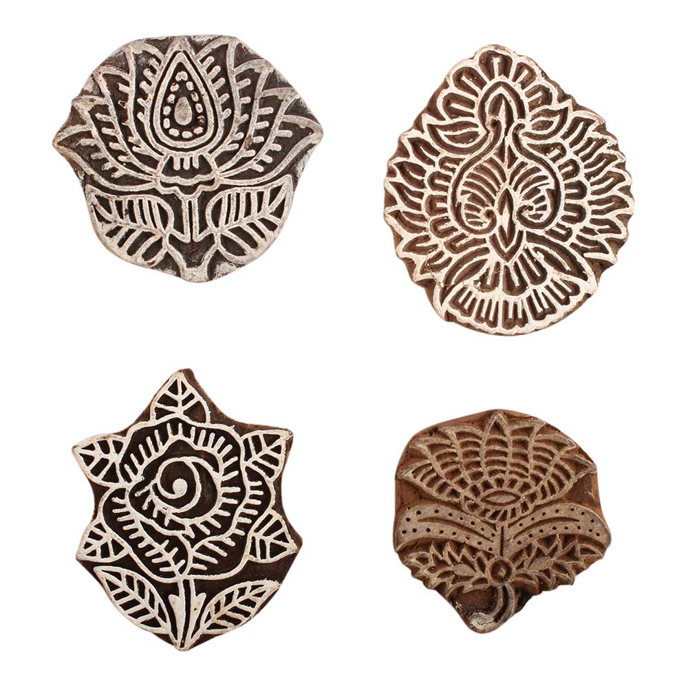 Set of 4 Piece New Mix Wooden Printing Block. Ideal for use on Fabric, Paper, Canvas, etc. These Blocks can be use to Print with Oil Colors, Fabric Colors, Water Colors, Acrylic Colors and Vegetable Colors.