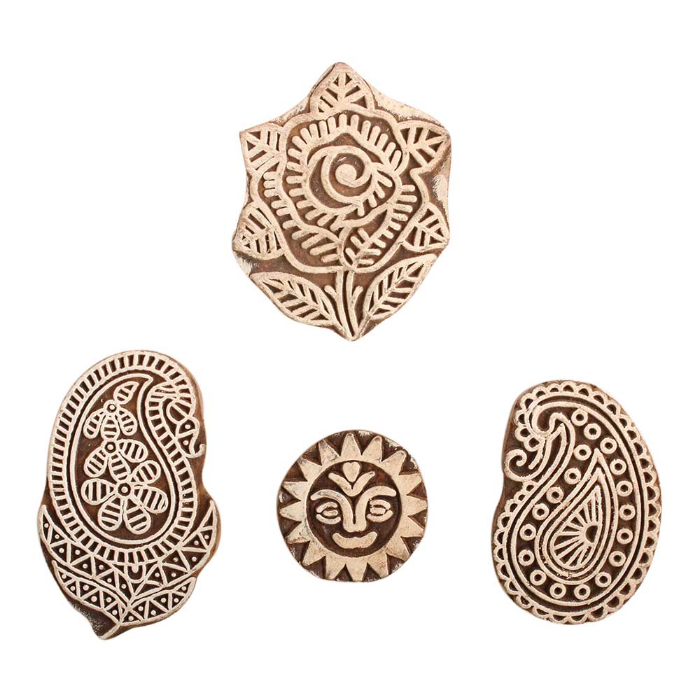Set of 4 Piece New Mix Wooden Printing Block. Ideal for use on Fabric, Paper, Canvas, etc. These Blocks can be use to Print with Oil Colors, Fabric Colors, Water Colors, Acrylic Colors and Vegetable Colors.