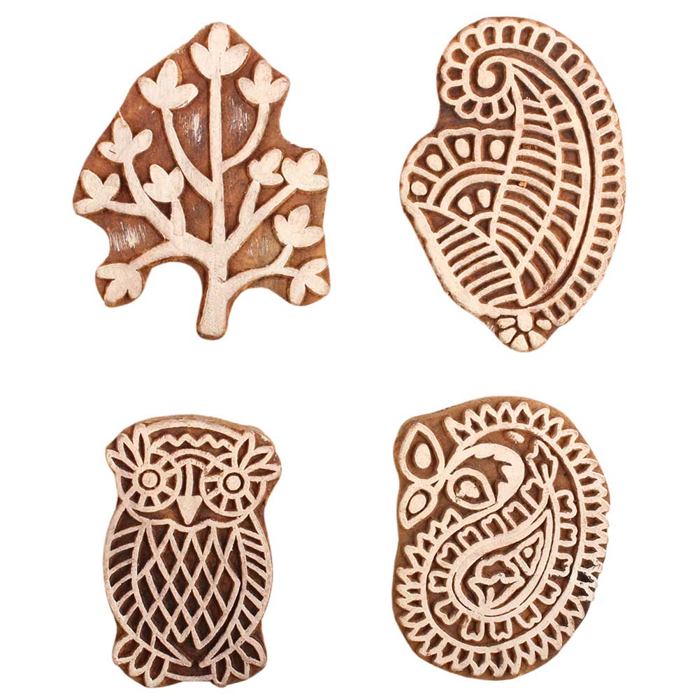 Set of 4 Piece New Mix Wooden Printing Block. Ideal for use on Fabric, Paper, Canvas, etc. These Blocks can be use to Print with Oil Colors, Fabric Colors, Water Colors, Acrylic Colors and Vegetable Colors.