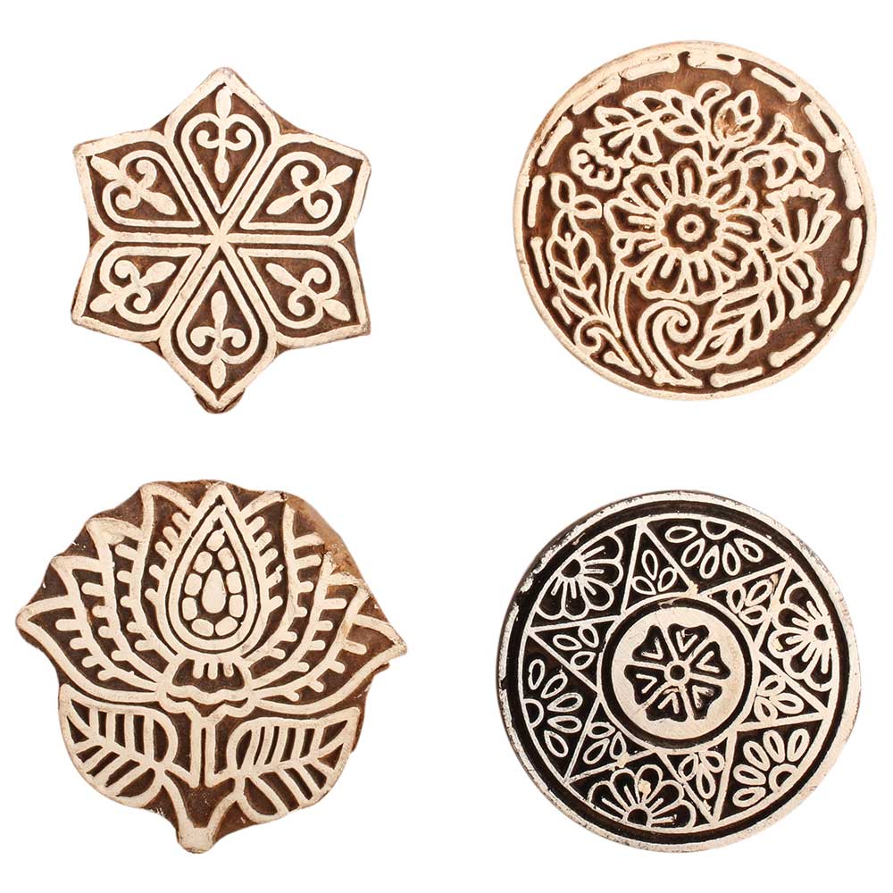 Set of 4 Piece New Mix Wooden Printing Block. Ideal for use on Fabric, Paper, Canvas, etc. These Blocks can be use to Print with Oil Colors, Fabric Colors, Water Colors, Acrylic Colors and Vegetable Colors.