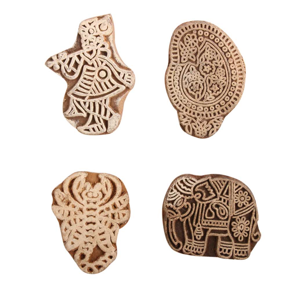 Set of 4 Piece New Mix Wooden Printing Block. Ideal for use on Fabric, Paper, Canvas, etc. These Blocks can be use to Print with Oil Colors, Fabric Colors, Water Colors, Acrylic Colors and Vegetable Colors.