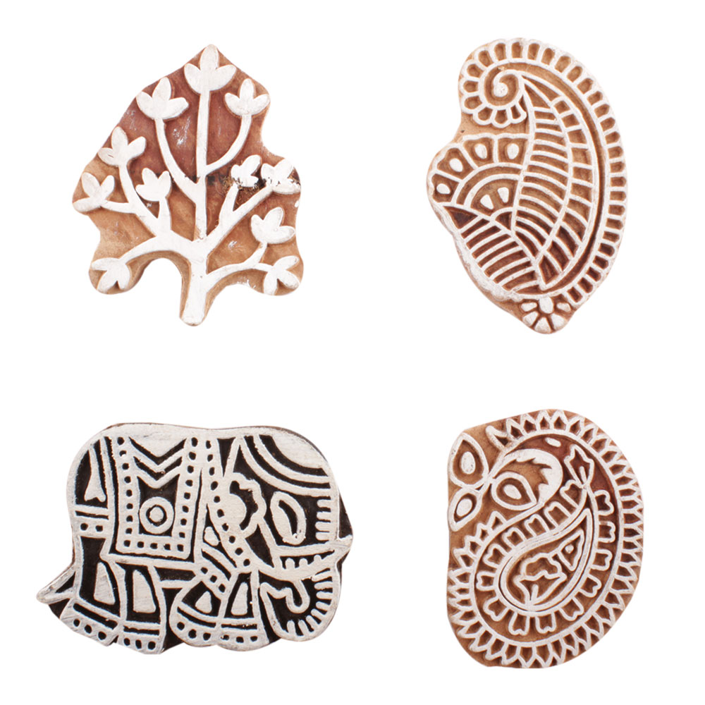 Set of 4 Piece New Mix Wooden Printing Block. Ideal for use on Fabric, Paper, Canvas, etc. These Blocks can be use to Print with Oil Colors, Fabric Colors, Water Colors, Acrylic Colors and Vegetable Colors.