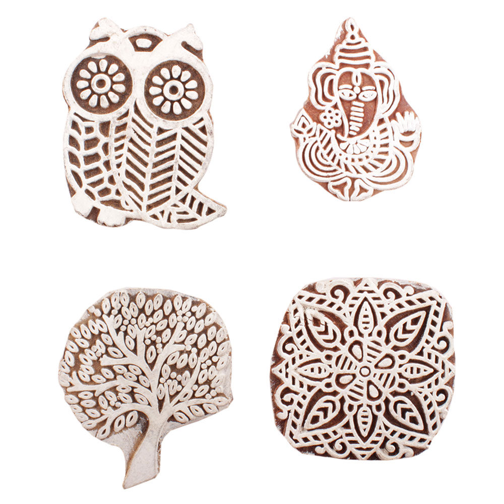 Set of 4 Piece New Mix Wooden Printing Block. Ideal for use on Fabric, Paper, Canvas, etc. These Blocks can be use to Print with Oil Colors, Fabric Colors, Water Colors, Acrylic Colors and Vegetable Colors.