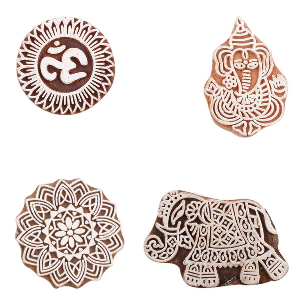 Set of 4 Piece New Mix Wooden Printing Block. Ideal for use on Fabric, Paper, Canvas, etc. These Blocks can be use to Print with Oil Colors, Fabric Colors, Water Colors, Acrylic Colors and Vegetable Colors.