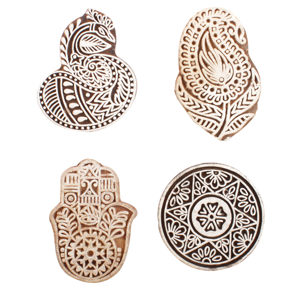 Set of 4 Piece New Mix Wooden Printing Block. Ideal for use on Fabric, Paper, Canvas, etc. These Blocks can be use to Print with Oil Colors, Fabric Colors, Water Colors, Acrylic Colors and Vegetable Colors.