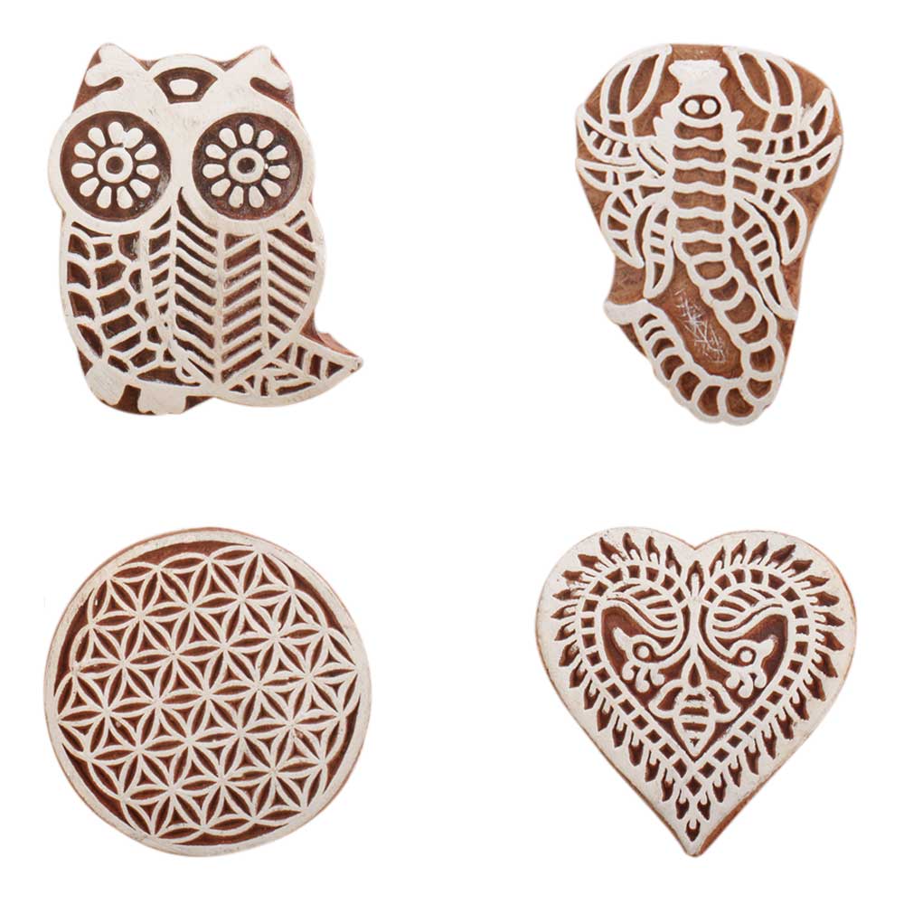 Set of 4 Piece New Mix Wooden Printing Block. Ideal for use on Fabric, Paper, Canvas, etc. These Blocks can be use to Print with Oil Colors, Fabric Colors, Water Colors, Acrylic Colors and Vegetable Colors.