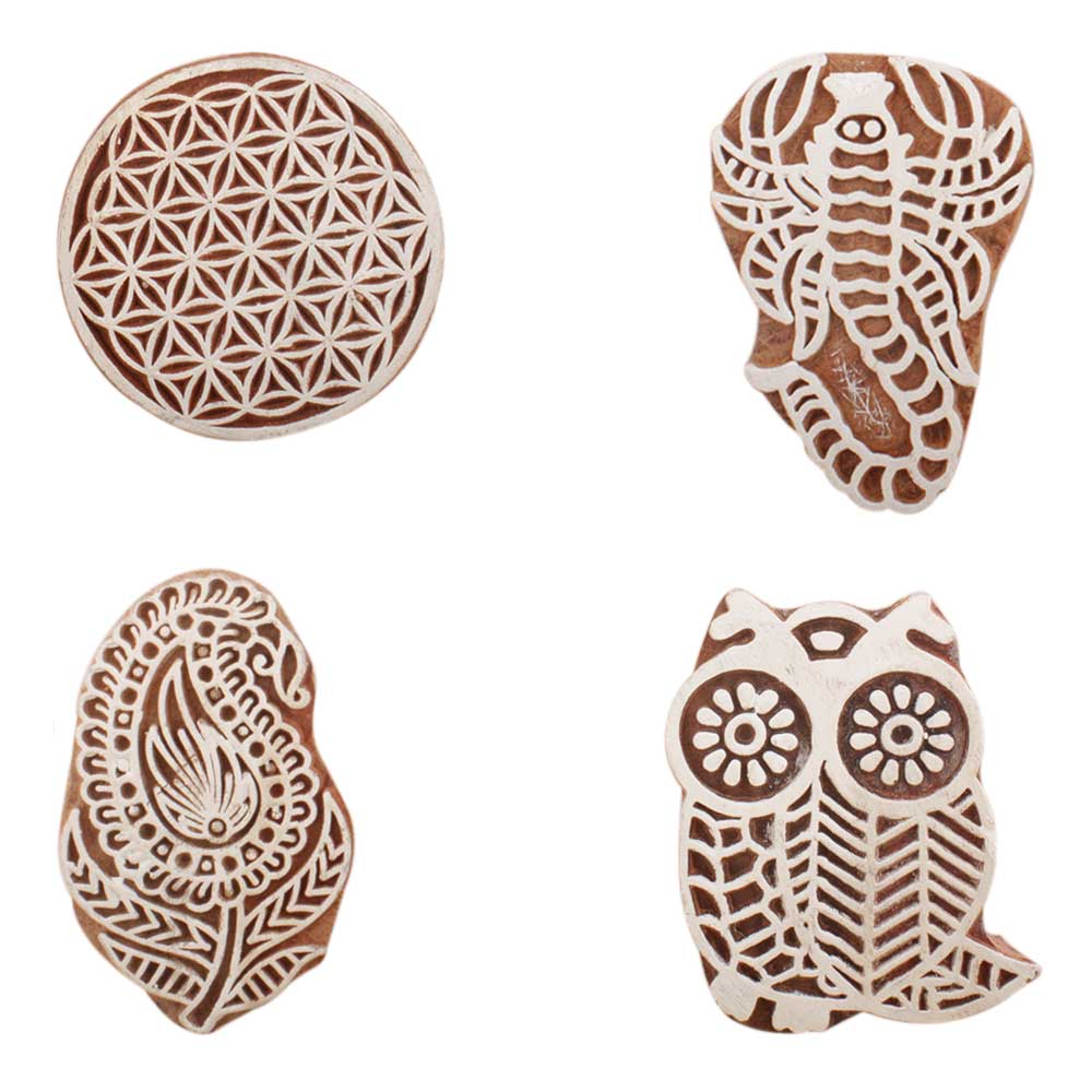 Set of 4 Piece New Mix Wooden Printing Block. Ideal for use on Fabric, Paper, Canvas, etc. These Blocks can be use to Print with Oil Colors, Fabric Colors, Water Colors, Acrylic Colors and Vegetable Colors.