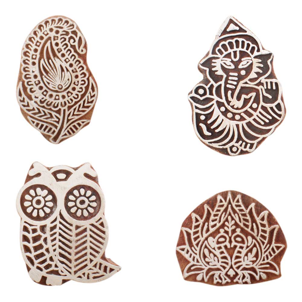 Set of 4 Piece New Mix Wooden Printing Block. Ideal for use on Fabric, Paper, Canvas, etc. These Blocks can be use to Print with Oil Colors, Fabric Colors, Water Colors, Acrylic Colors and Vegetable Colors.
