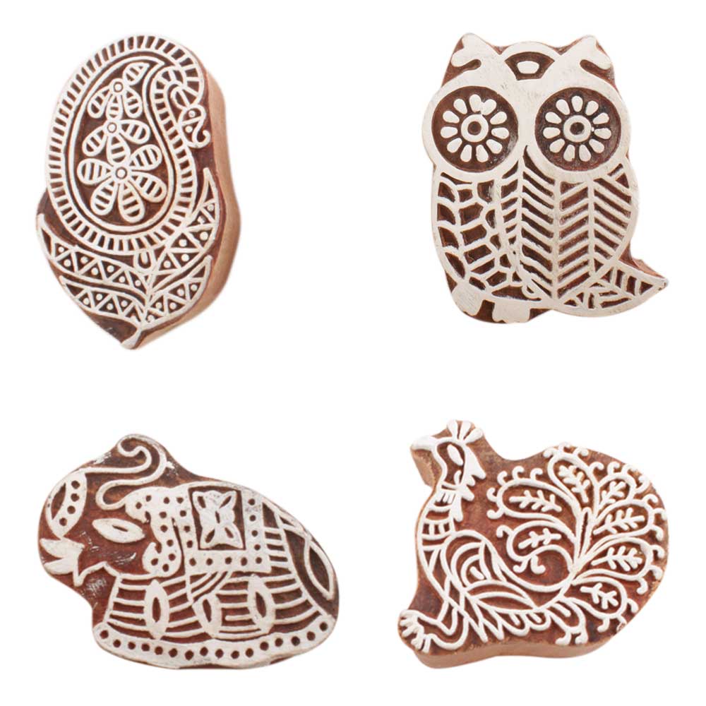 Set of 4 Piece New Mix Wooden Printing Block. Ideal for use on Fabric, Paper, Canvas, etc. These Blocks can be use to Print with Oil Colors, Fabric Colors, Water Colors, Acrylic Colors and Vegetable Colors.