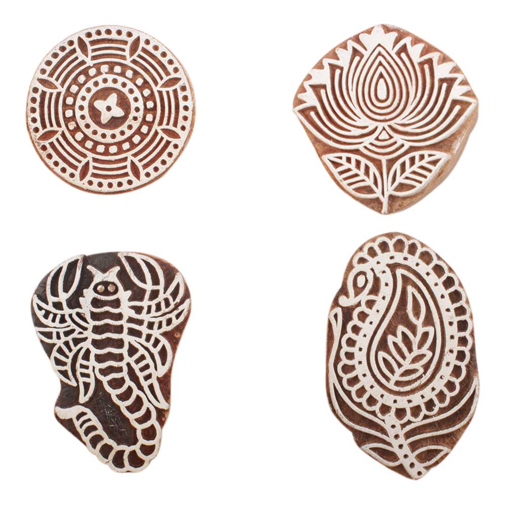 Set of 4 Piece New Mix Wooden Printing Block. Ideal for use on Fabric, Paper, Canvas, etc. These Blocks can be use to Print with Oil Colors, Fabric Colors, Water Colors, Acrylic Colors and Vegetable Colors.
