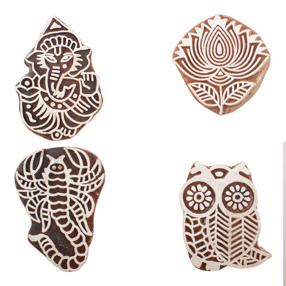 Set of 4 Piece New Mix Wooden Printing Block. Ideal for use on Fabric, Paper, Canvas, etc. These Blocks can be use to Print with Oil Colors, Fabric Colors, Water Colors, Acrylic Colors and Vegetable Colors.