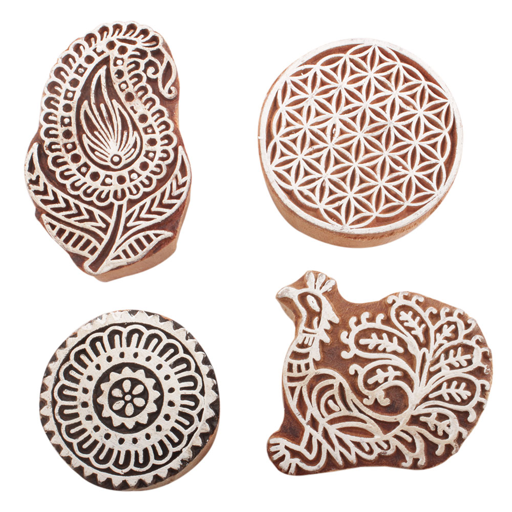 Set of 4 Piece New Mix Wooden Printing Block. Ideal for use on Fabric, Paper, Canvas, etc. These Blocks can be use to Print with Oil Colors, Fabric Colors, Water Colors, Acrylic Colors and Vegetable Colors.